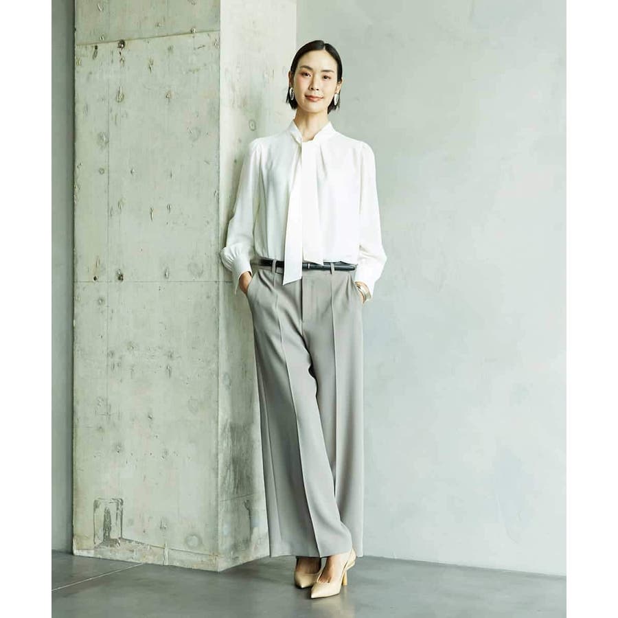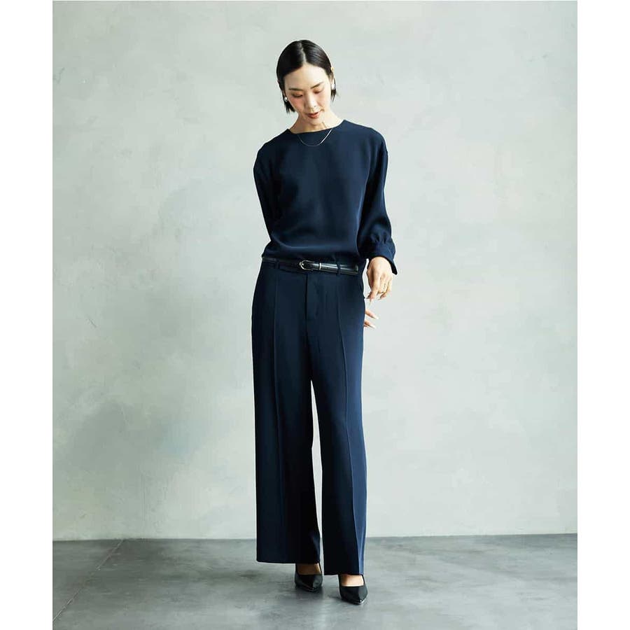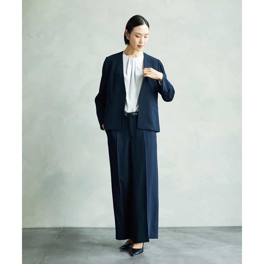 同素材のジャケットやブラウスとのセットアップがおすすめです。日常の通勤スタイルから卒園、卒業や入園、入学などのセレモニーシーン、七五三や学校行事、発表会などお子様のハレの日にも◎フォーマルな場やビジネスシーンに活躍します。ワイドパンツとセットアップなら、堅苦しくない“ちょっと改まった席”にもぴったり。上下にコントラストを効かせた 脚長に見えるバランス感が、スタイルアップ効果が見込めます◎