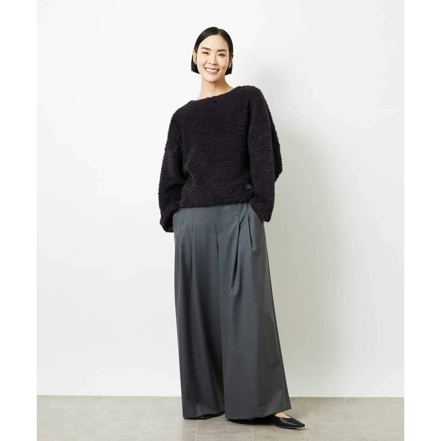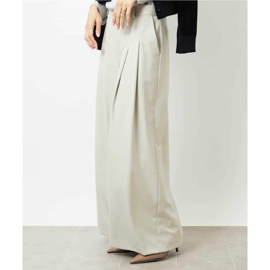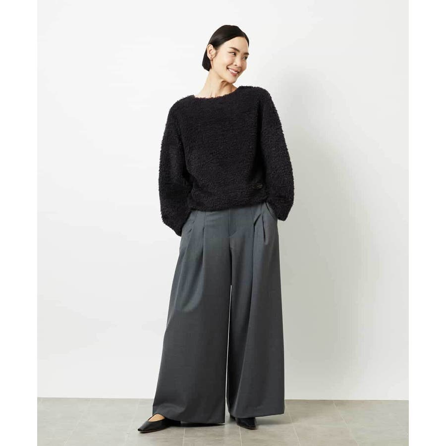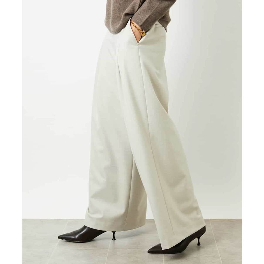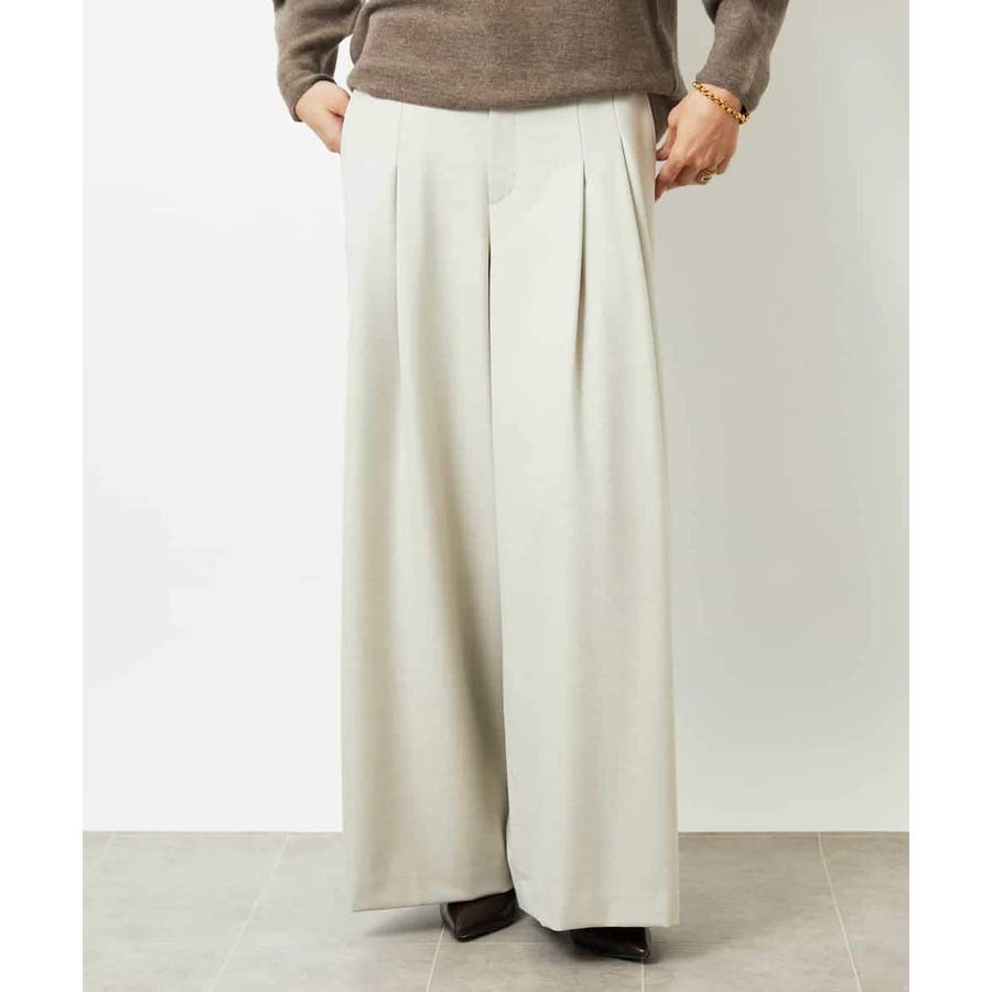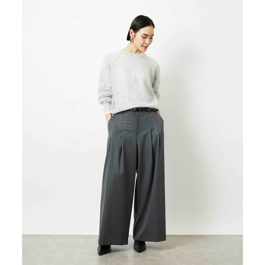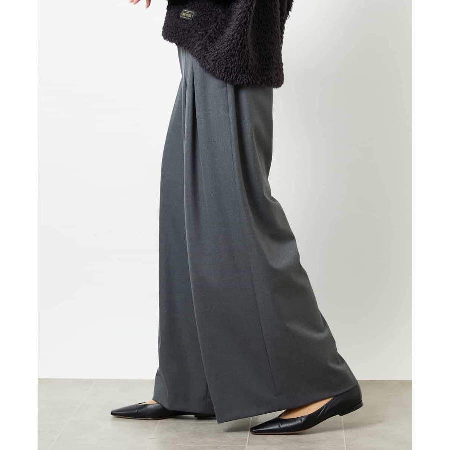 裏側は微起毛で暖かく、表面はすっきりとした素材感のワイドパンツ。縦のラインを強調するタックとセンタープレスがメリハリのあるシルエットを作り、落ち着いた印象と脚長効果を演出します。メンズパンツのようなストレートベルトデザインで、腰まわりがカービーにならずすっきり見える仕上がりになっています。36・40サイズは限定店舗展開です。