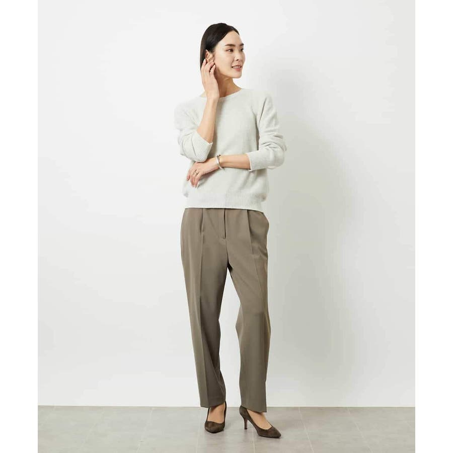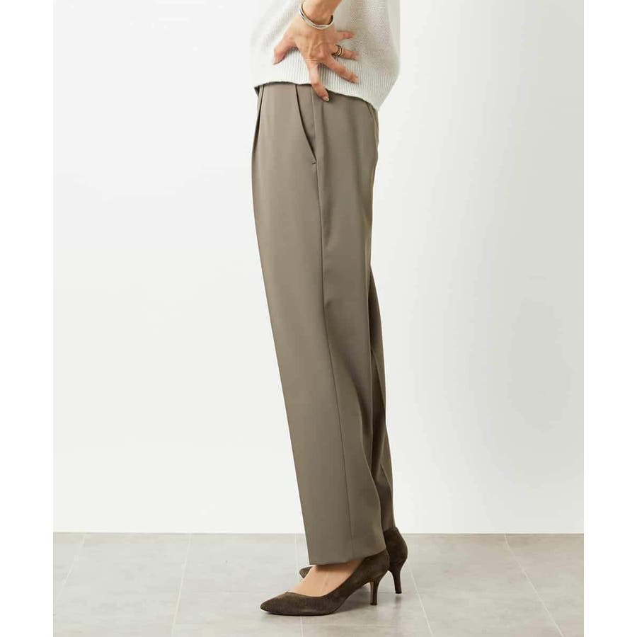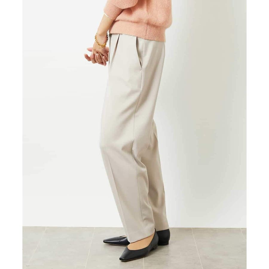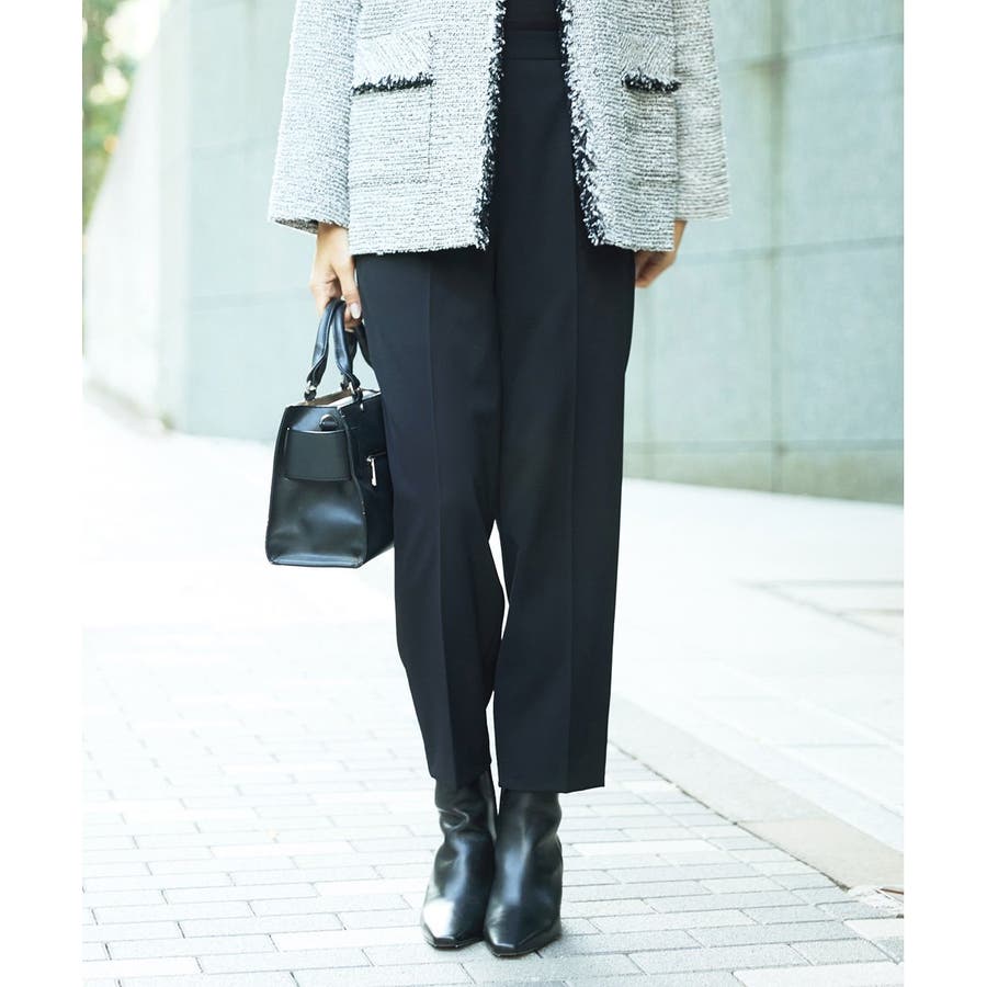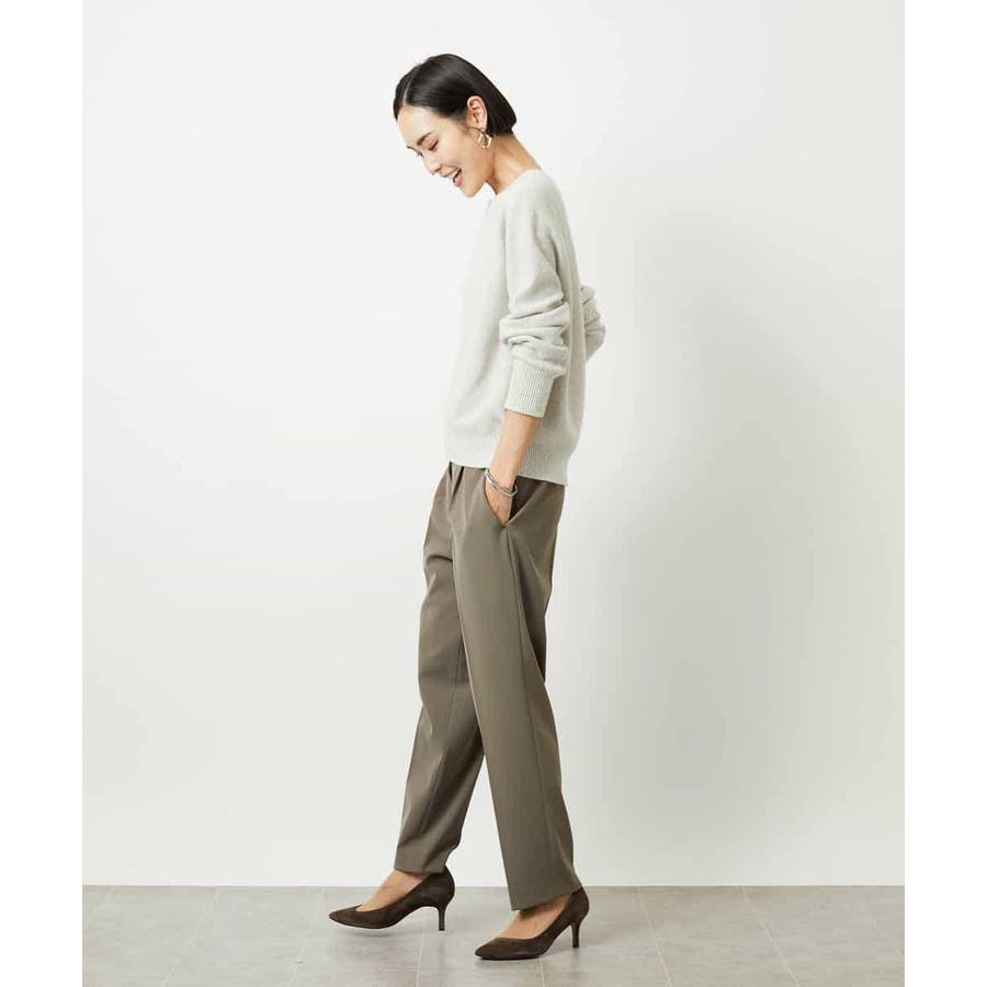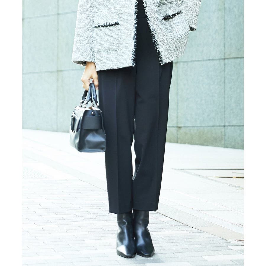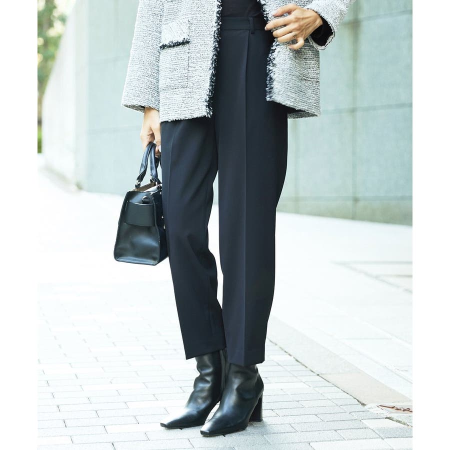 すっきりとしたテーパードシルエットのパンツなので、ボリュームニットと合わせてカジュアルに、きれいめトップスと合わせてオフィススタイルにと、幅広く着回せます。フラットシューズはもちろん、ブーツインでも足元の変化を楽しめます。