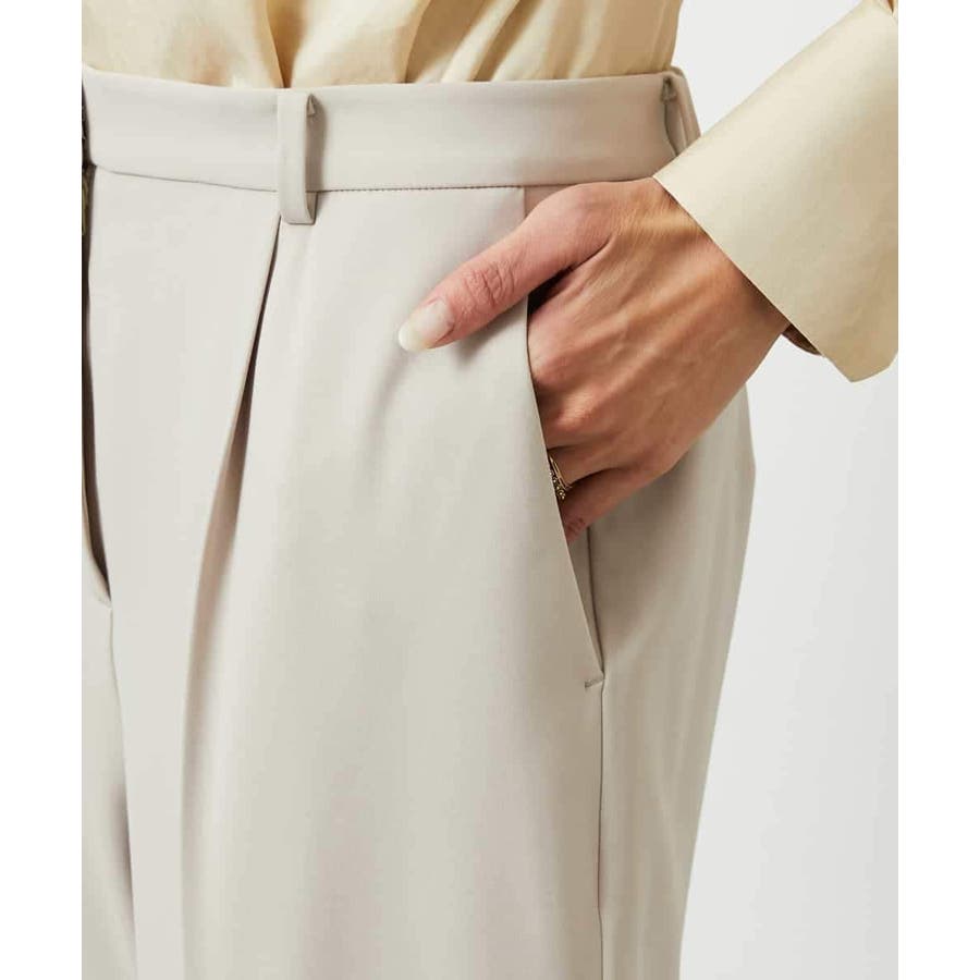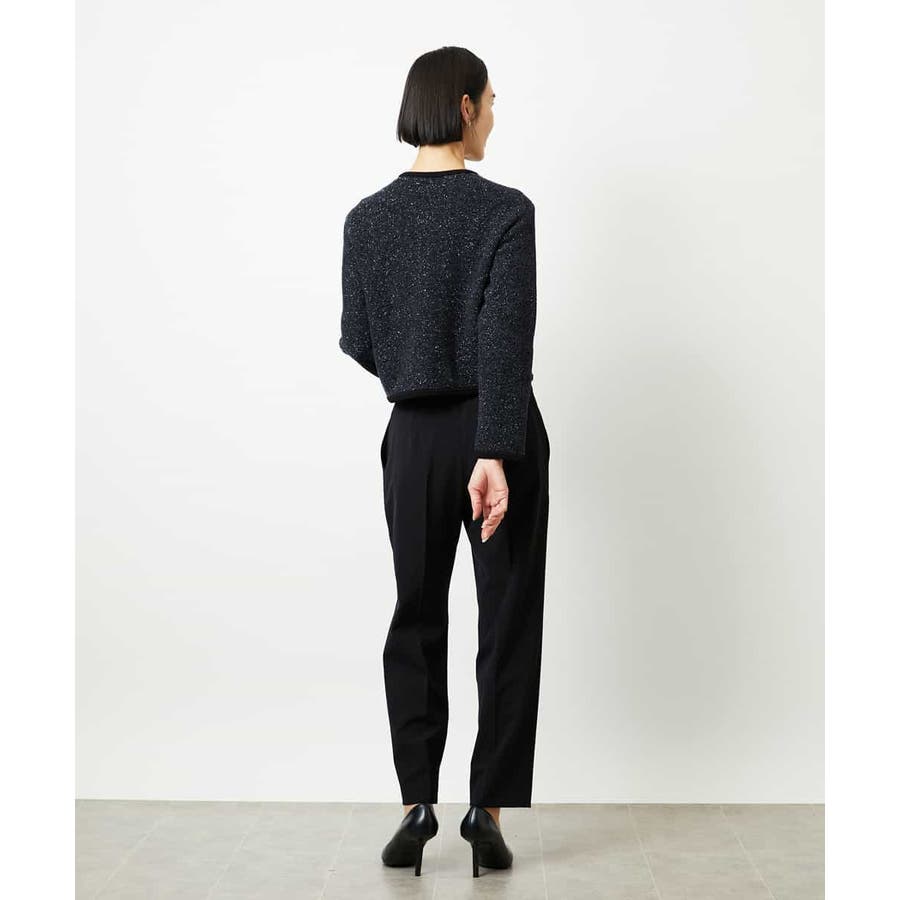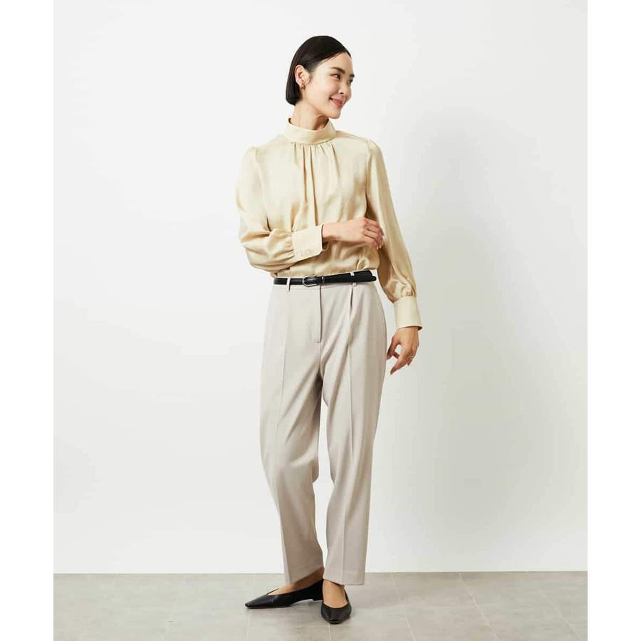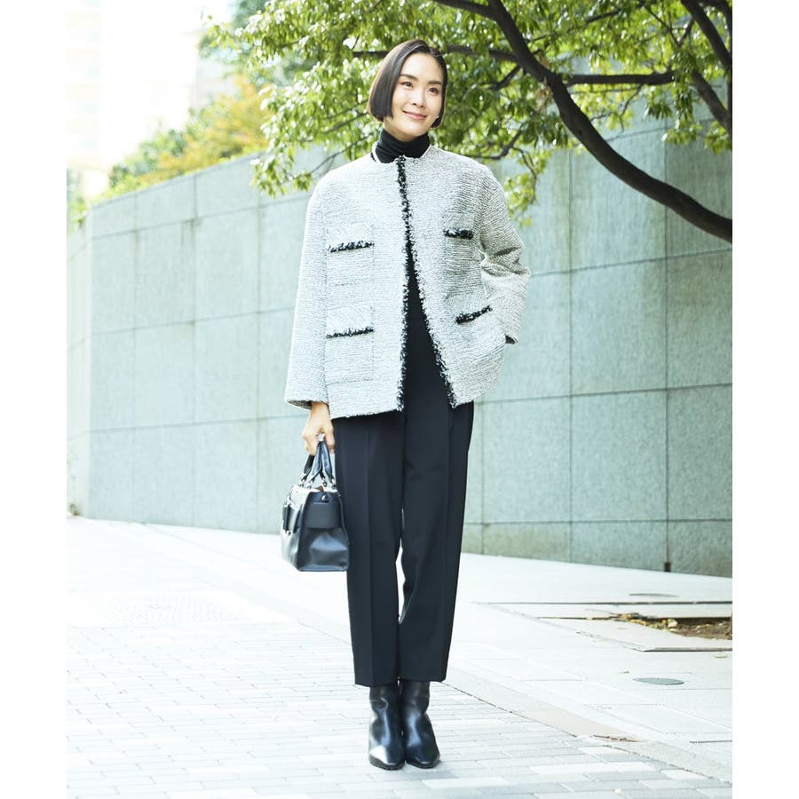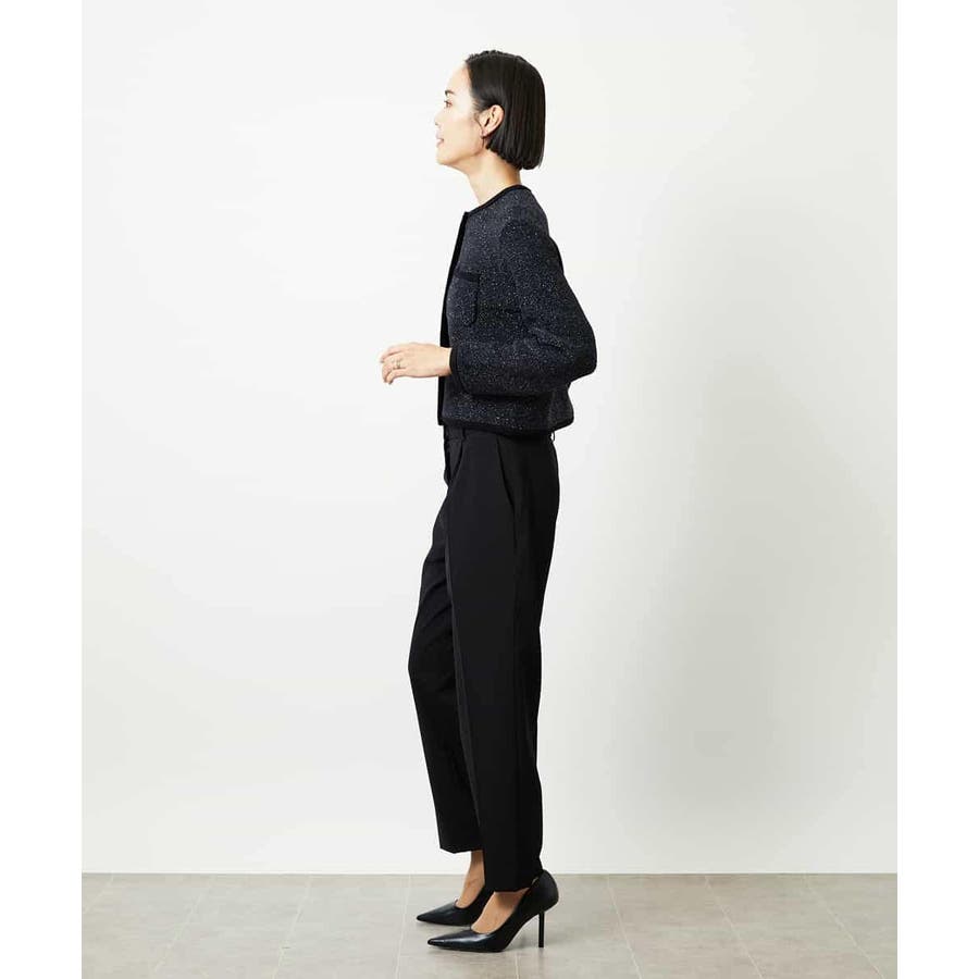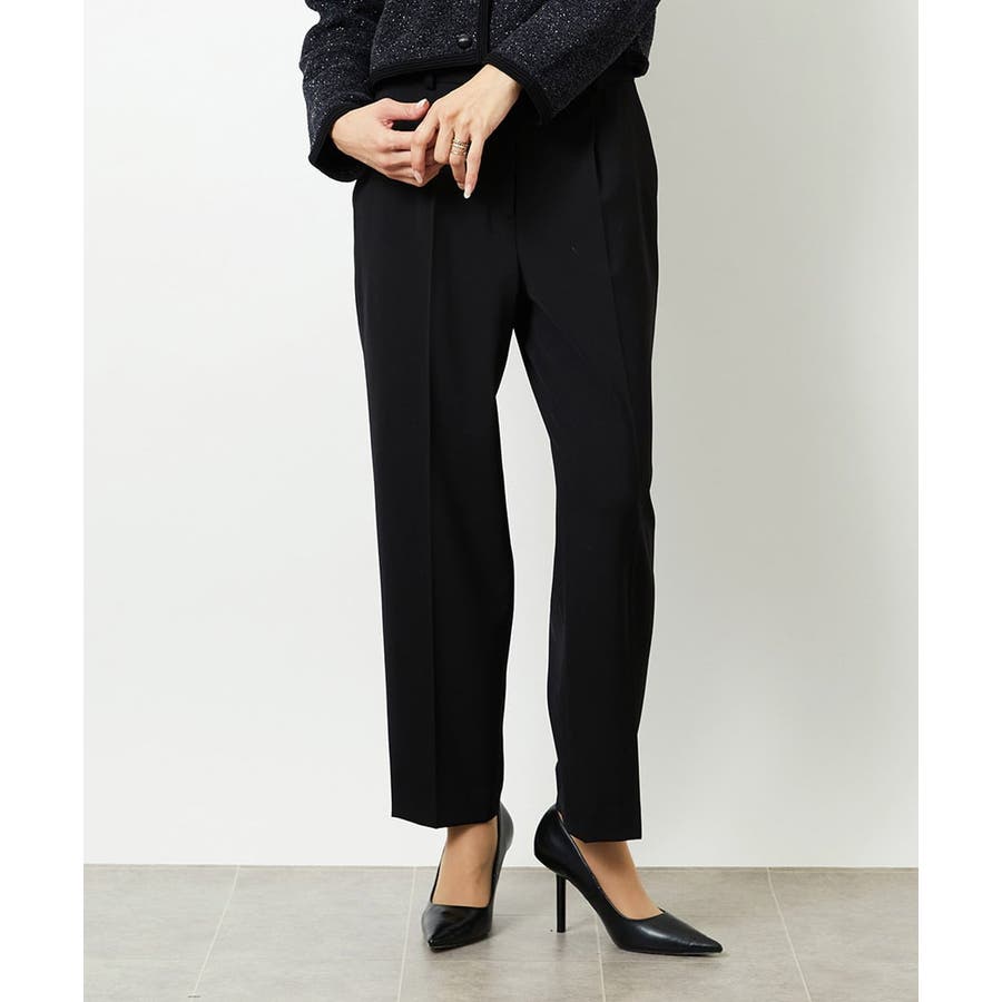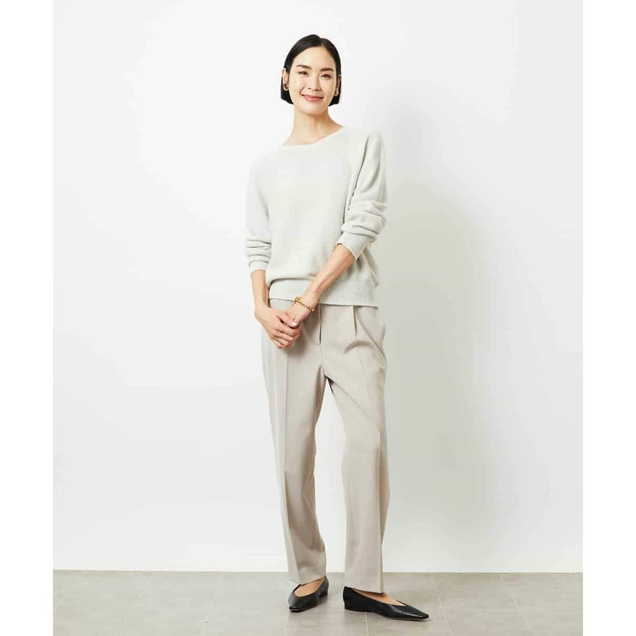 すっきりとしたテーパードシルエットのパンツなので、ボリュームニットと合わせてカジュアルに、きれいめトップスと合わせてオフィススタイルにと、幅広く着回せます。フラットシューズはもちろん、ブーツインでも足元の変化を楽しめます。