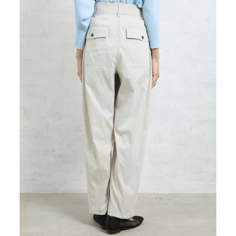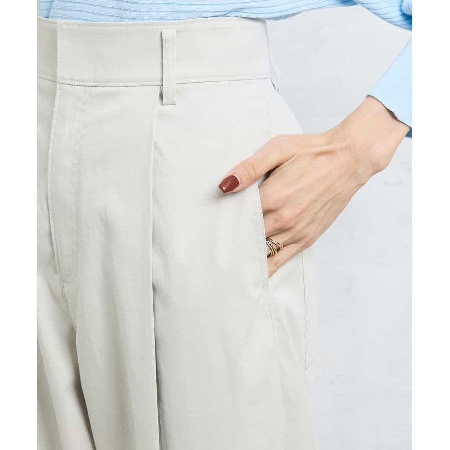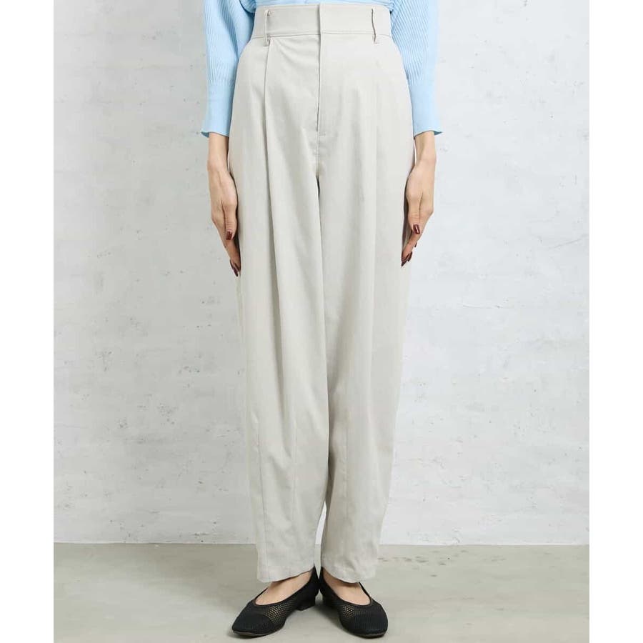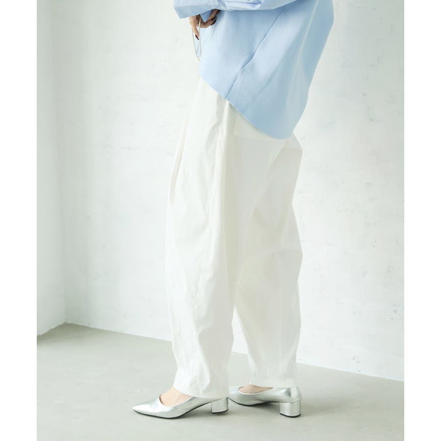 ウエストにタックを施し、ゆったりとしたヒップラインのパンツです。ウエストのベルト部分を高めに配置し、足長効果のあるうれしい1枚です。裾にかけてボリュームを絞りました。裾はご自身で調節できる折り返しスタイルです。40サイズは限定店舗展開です。