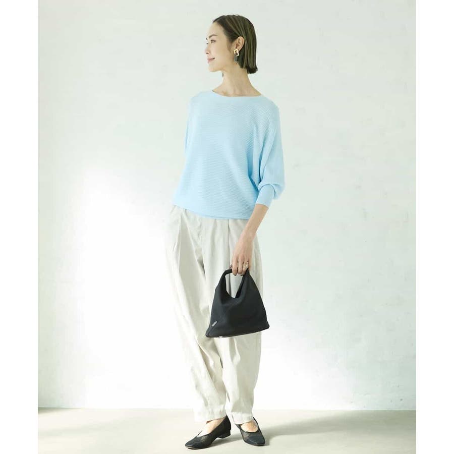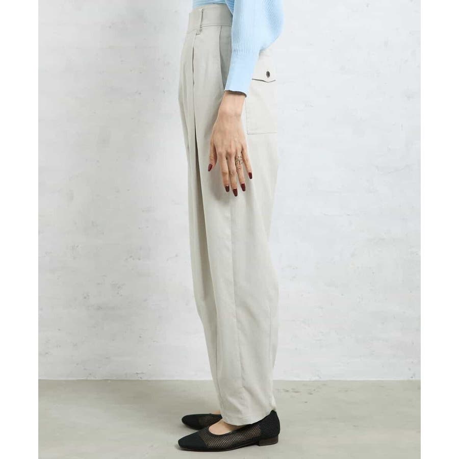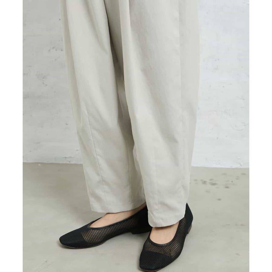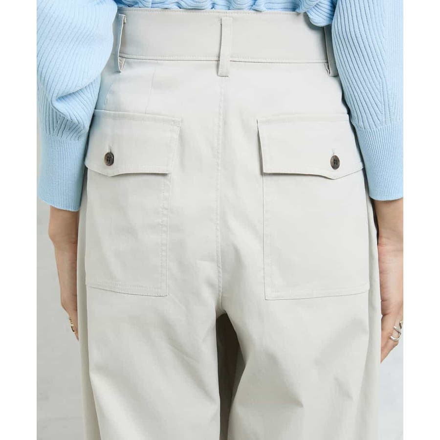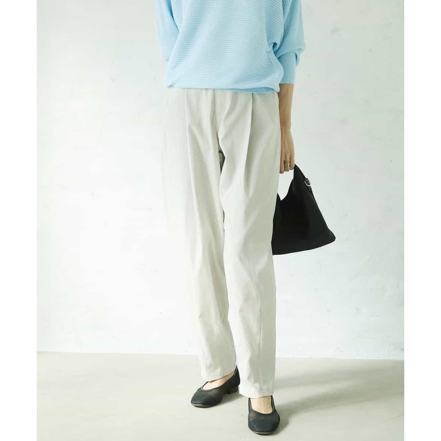 ウエストにタックを施し、ゆったりとしたヒップラインのパンツです。ウエストのベルト部分を高めに配置し、足長効果のあるうれしい1枚です。裾にかけてボリュームを絞りました。裾はご自身で調節できる折り返しスタイルです。40サイズは限定店舗展開です。