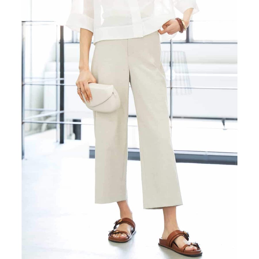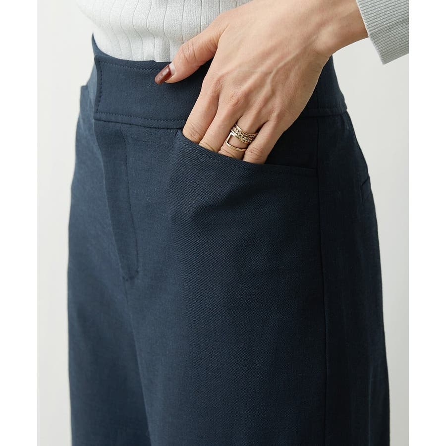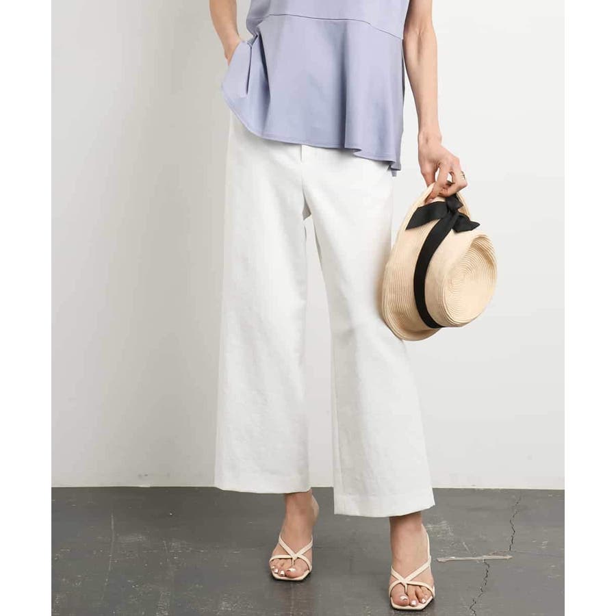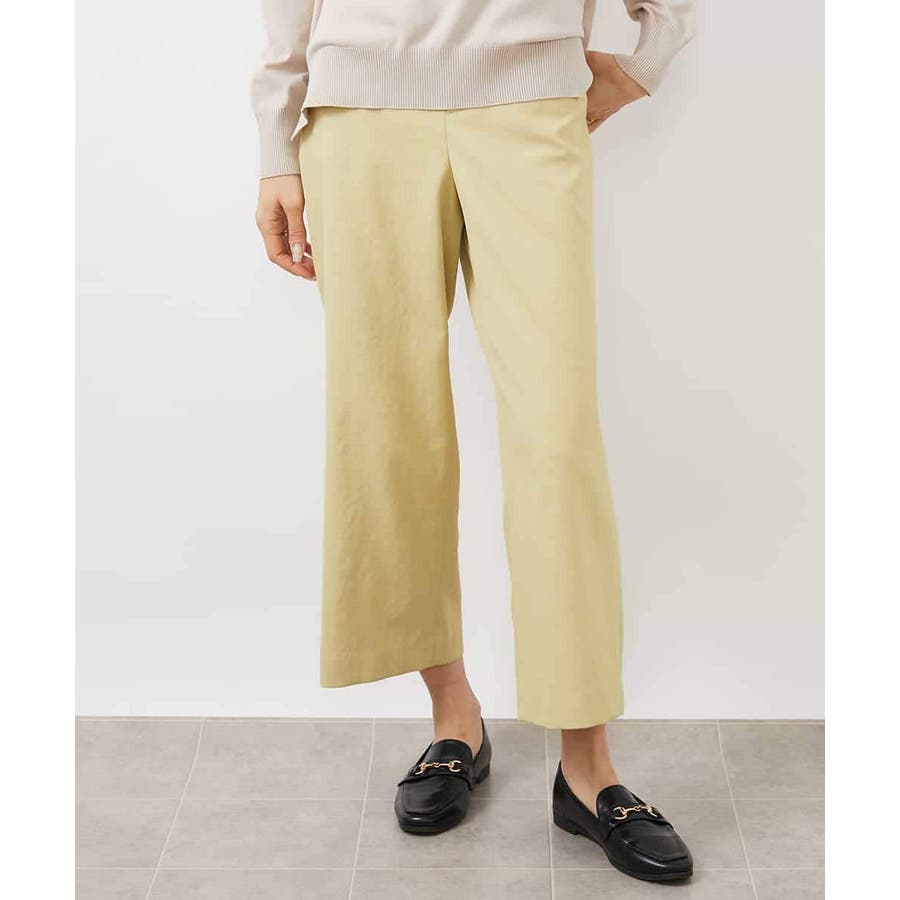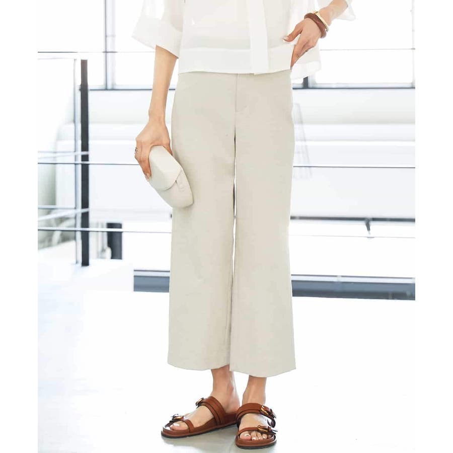 ミッシェルクラン定番のクロップド丈ワイドパンツ、ナチュラル見えするサラッとした麻混の素材感とストレッチが効いているので履き心地が良く楽に着用できます。