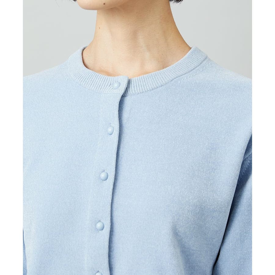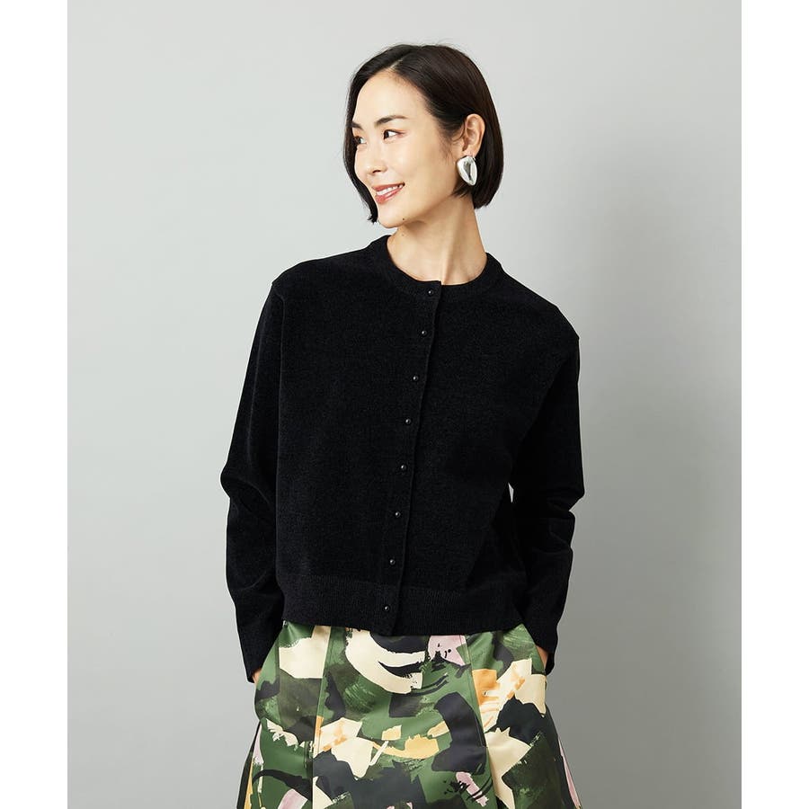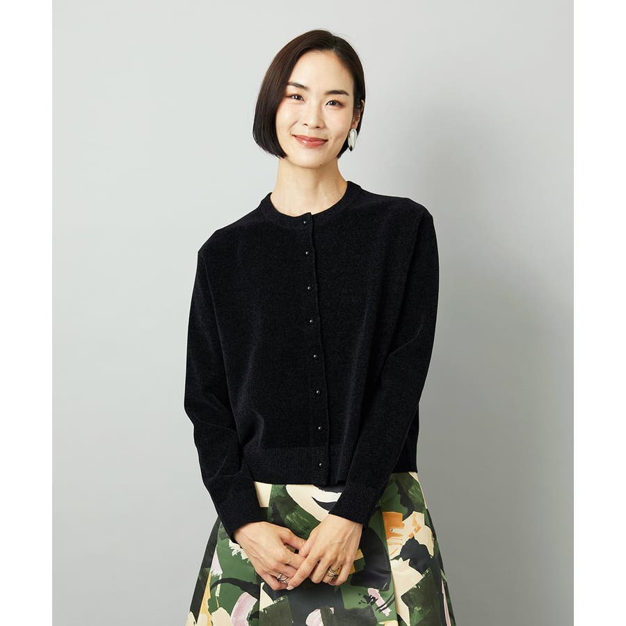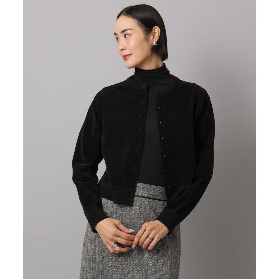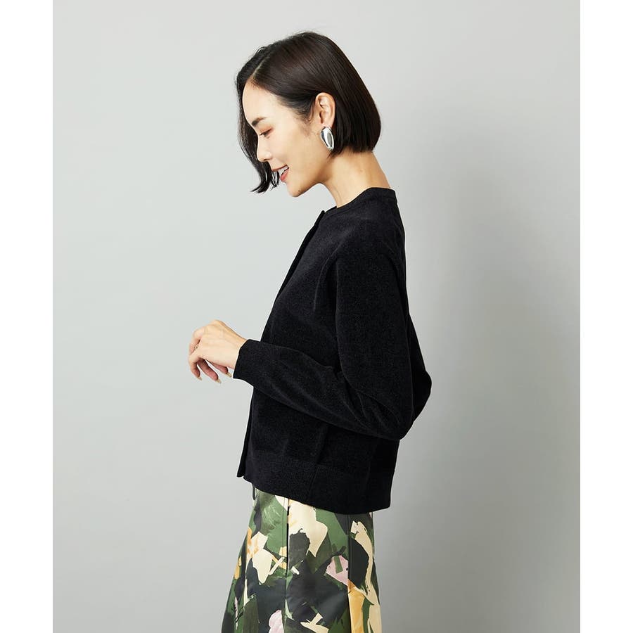 ベルベットのような光沢感をもつモール糸で仕立てたコンパクト丈カーディガン。程よいハリがあり、シルエットをすっきりと引き立てます。同色で塗装したメタルボタンがさりげないアクセントに。ボタンを留めればプルオーバーのようにも着られ、幅広いスタイリングを楽しめる一枚です。40サイズは限定店舗展開です。