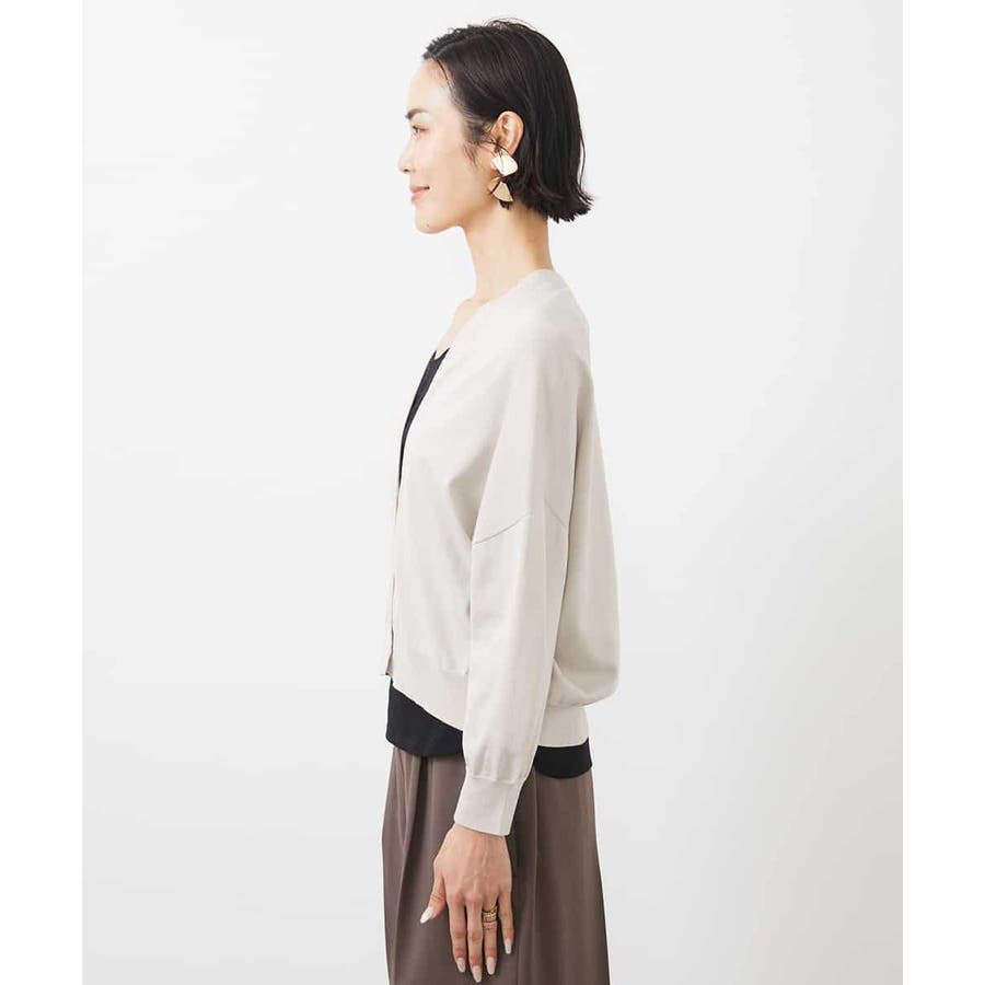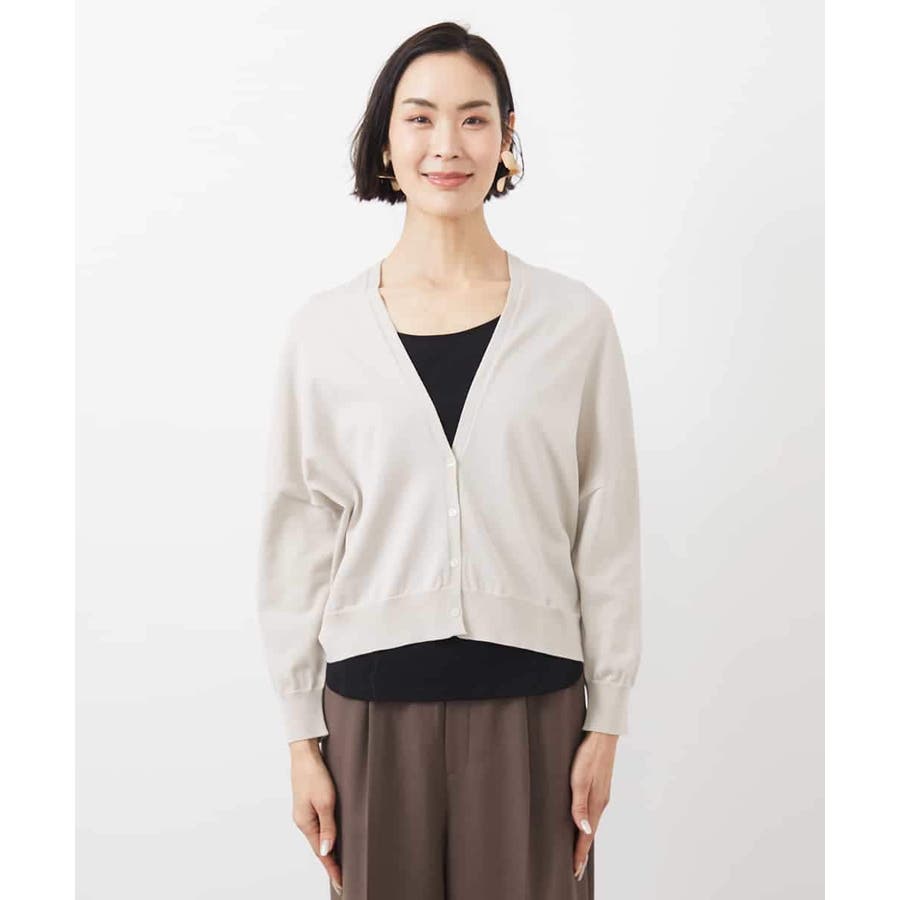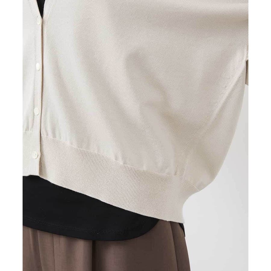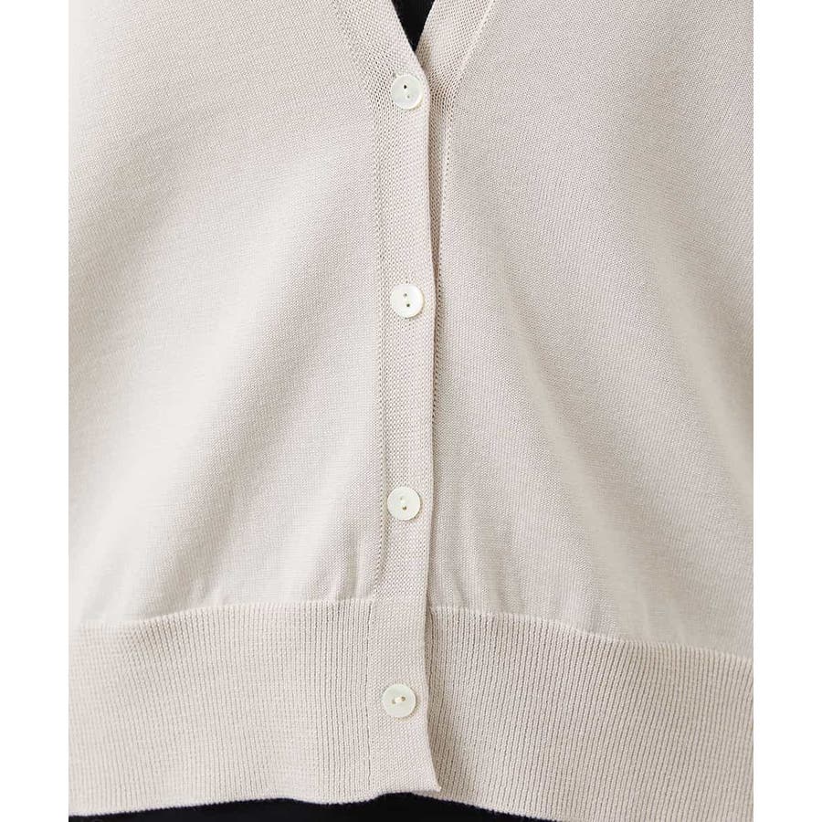 ボレロの様にも羽織っていただける、後ろに抜ける形のクロップド丈のVカーデです。釦ホールがミシンのステッチではなく、編みで開いているので、閉じずに着ていただく際にも、繊細で美しい仕上がりです。40サイズは限定店舗展開です。