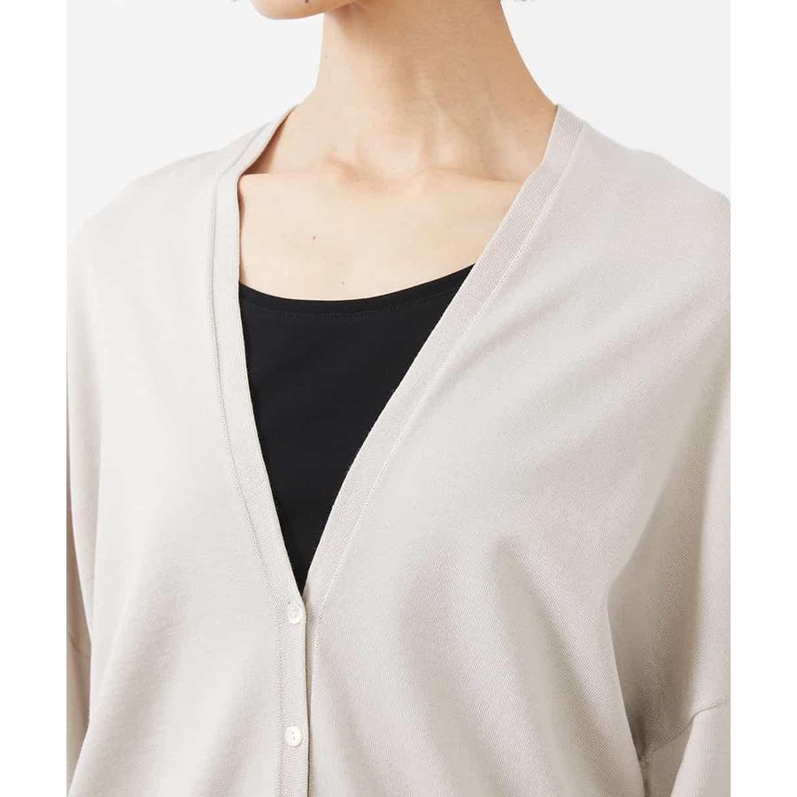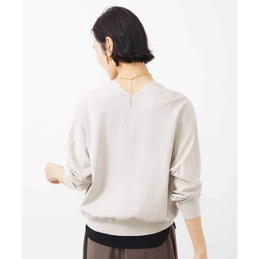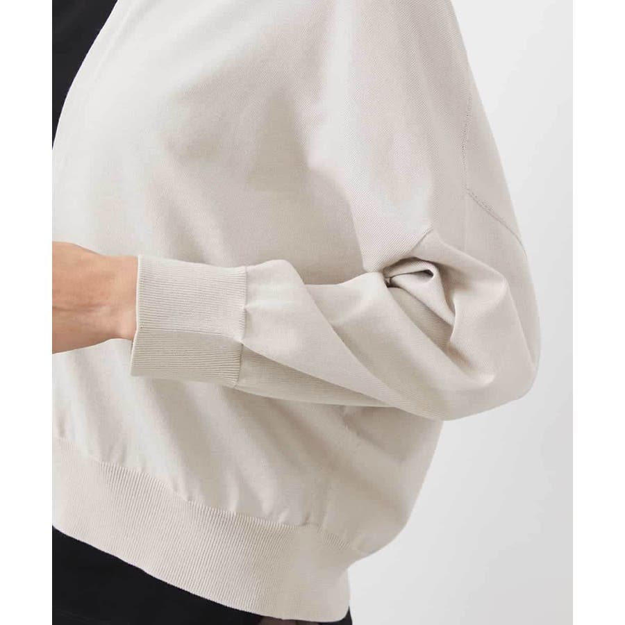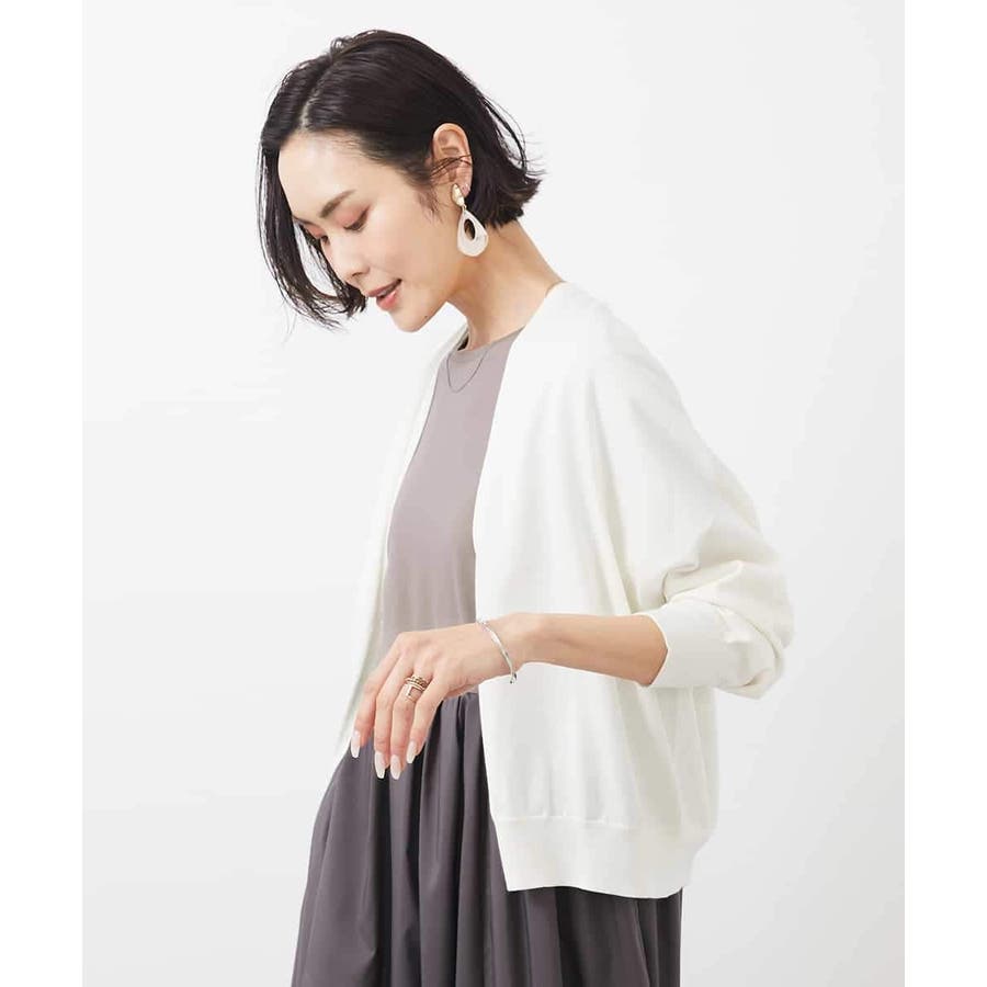 ボレロの様にも羽織っていただける、後ろに抜ける形のクロップド丈のVカーデです。釦ホールがミシンのステッチではなく、編みで開いているので、閉じずに着ていただく際にも、繊細で美しい仕上がりです。40サイズは限定店舗展開です。