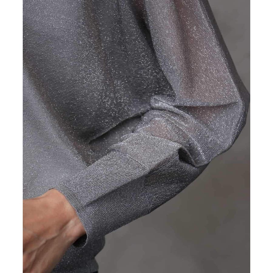 ラメのきらめく、シアーでドライ風合いとレーヨンの程よい落ち感が特徴の素材です。透け過ぎず着やすい風合いです。