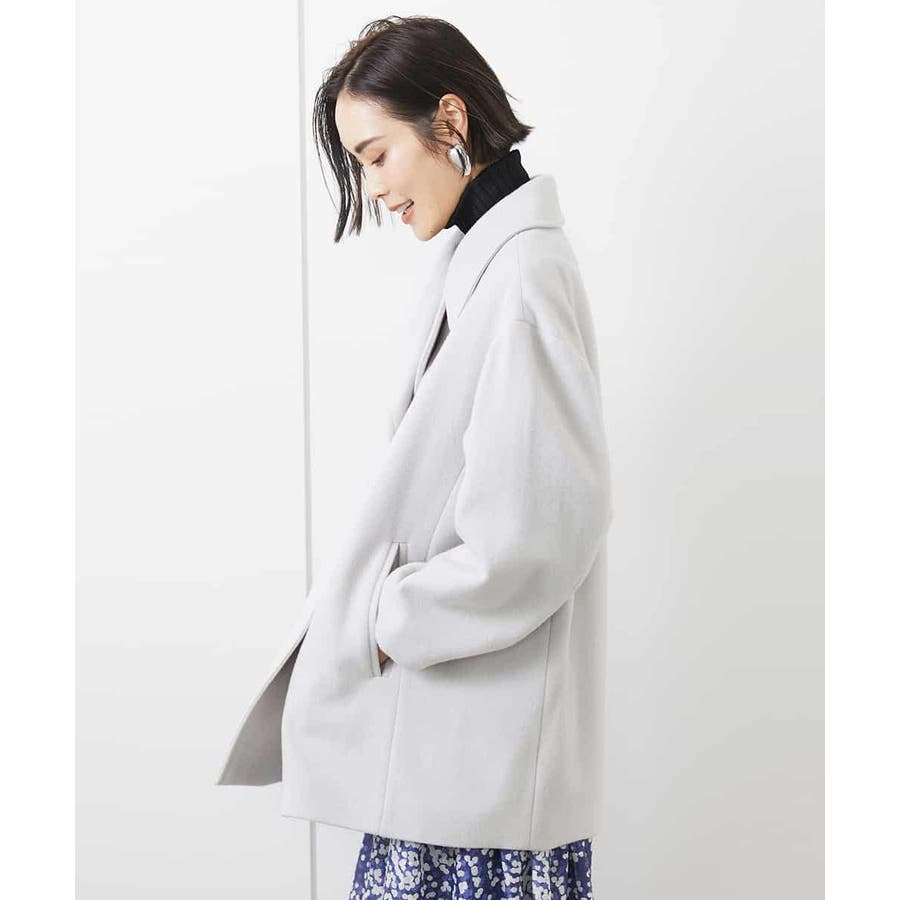オーバーサイズのPコート、大きめの衿がポイント+程よいVネックデザインで小顔効果抜群で、取り外しができるストラップでスタンドカラーにすると雰囲気が変わり暖かく着用できます。