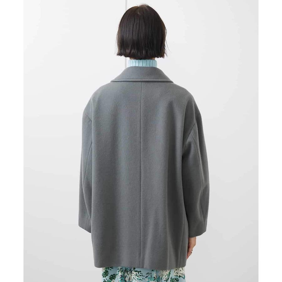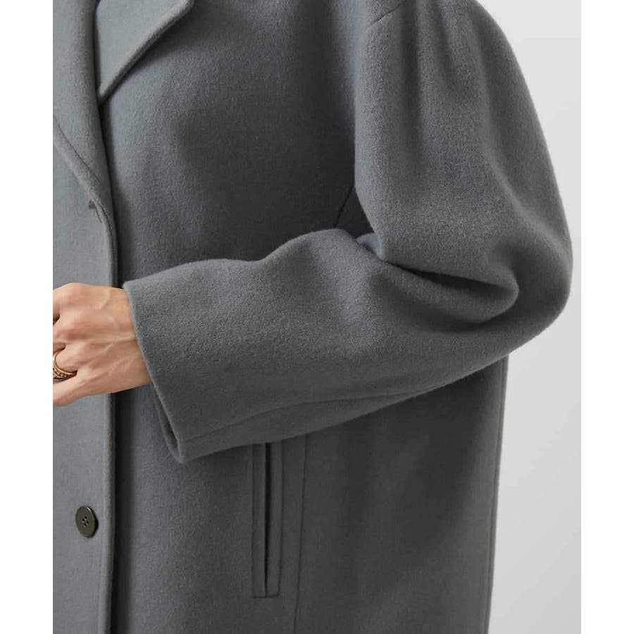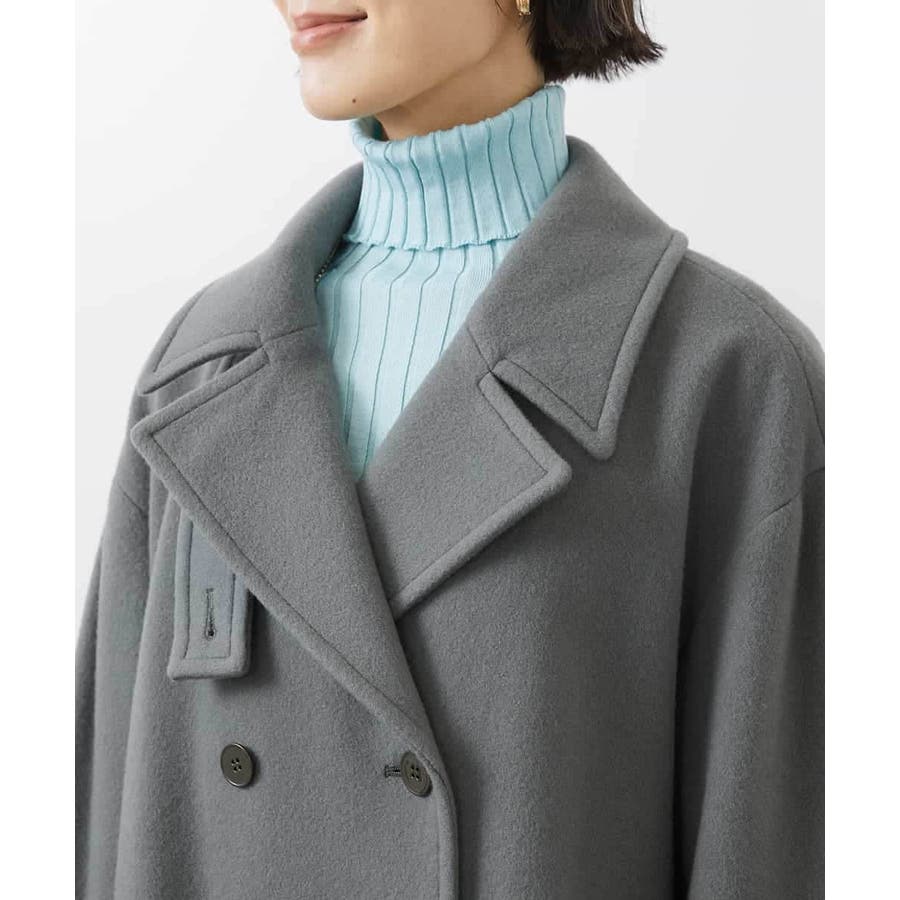 肩を落としたリラクシーなサイズ感のPコート。インナーを選ばず着用いただけるサイズ感。大きめの衿がデザインポイント。着用時に華奢見えするよう、ゆとり感とシルエットの美しさにこだわりました。取り外しができるチンストラップもポイントです。チンストラップをつけてスタンドカラー風にも着用いただけます。 40サイズは限定店舗展開です。