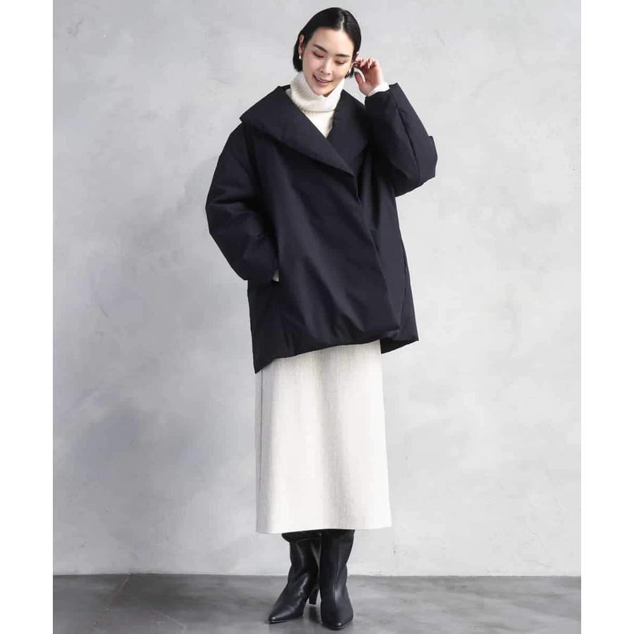 大きなショールカラーと立体的なコクーンシルエットが特徴のデザイン性の高いダウンコート。ミドル丈で合わせやすく、オーバーサイズながらパーツごとにダウン量を調整することで、すっきりとしたシルエットに仕上げています。前を開けたときに見えるさりげないメタルホックが上品なアクセントです。