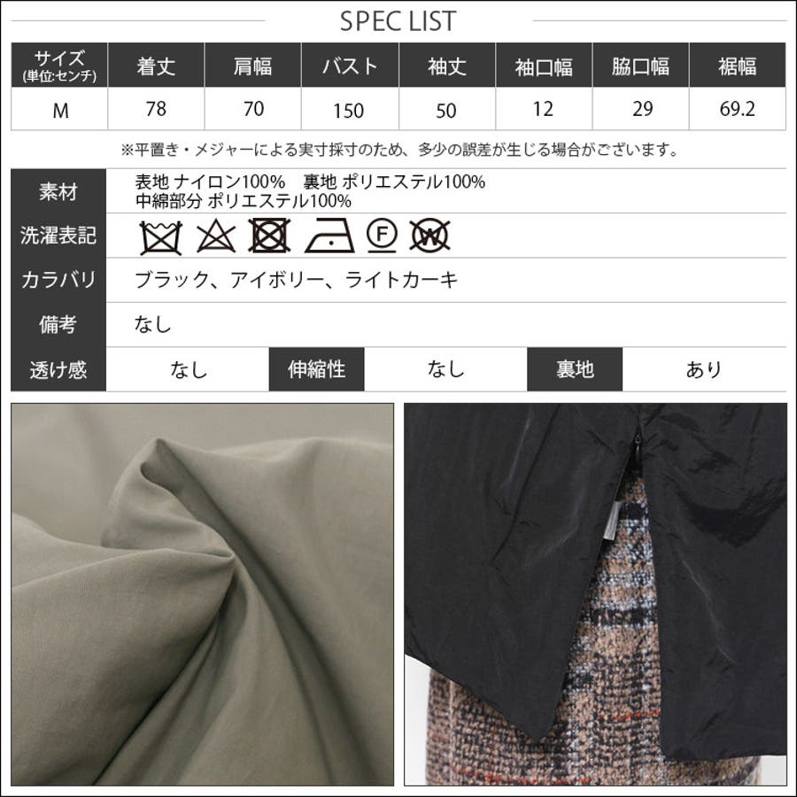 素材:ナイロン100% (裏地)ポリエステル100%(中綿)ポリエステル100%