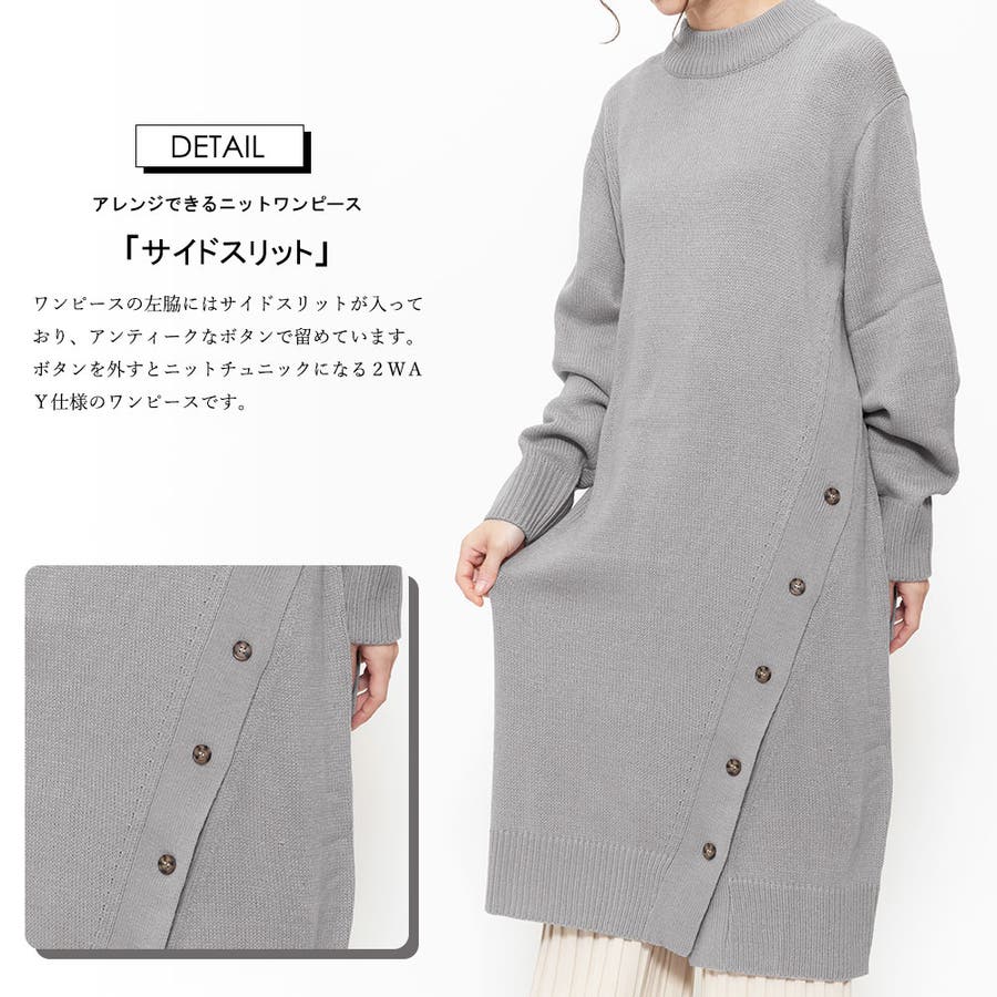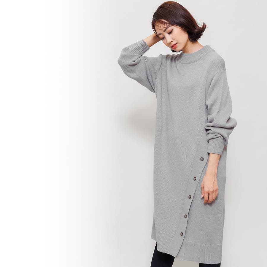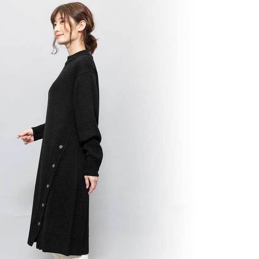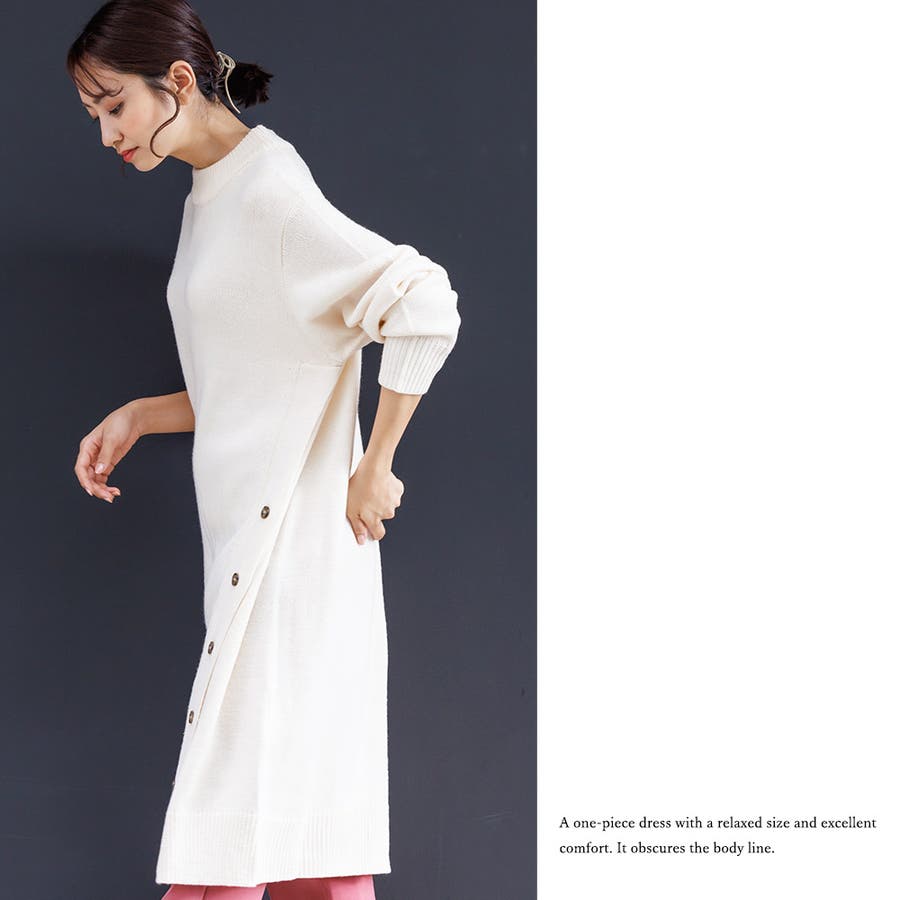 ウール混ニットワンピース ボタン袖 サイドスリット