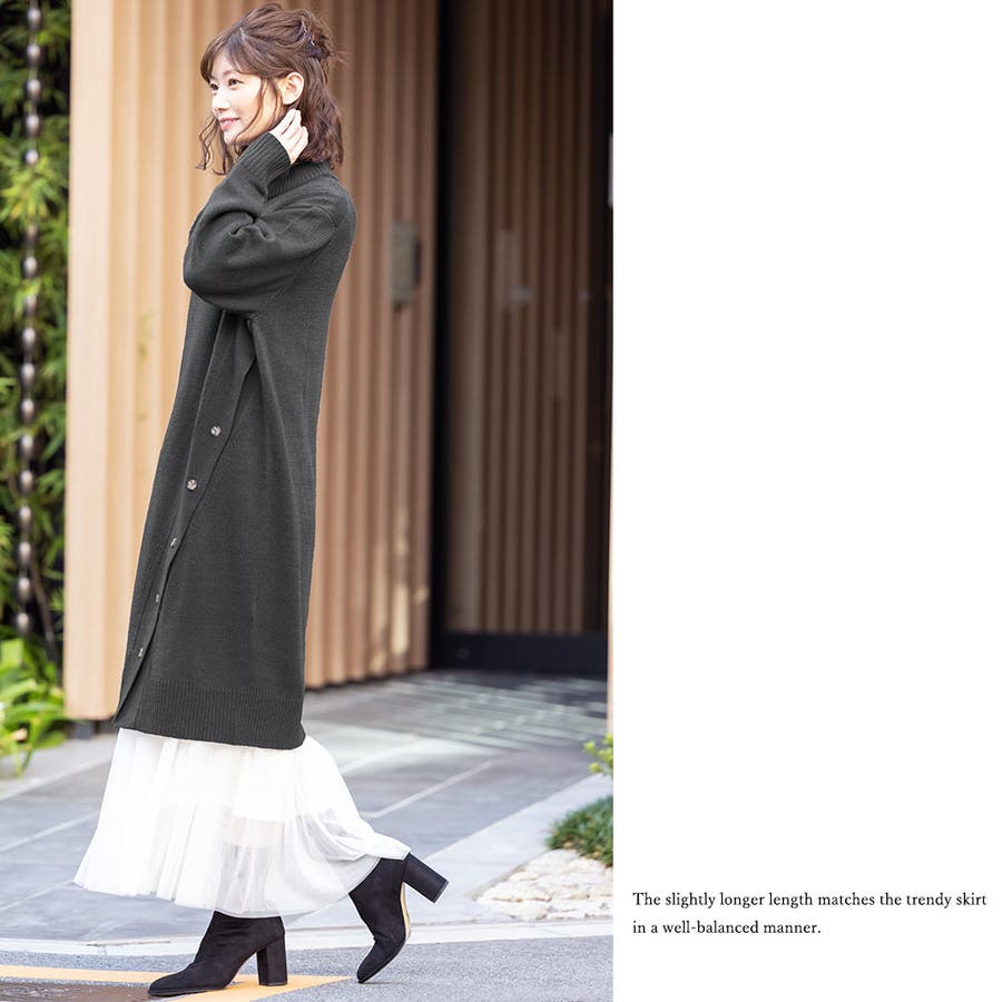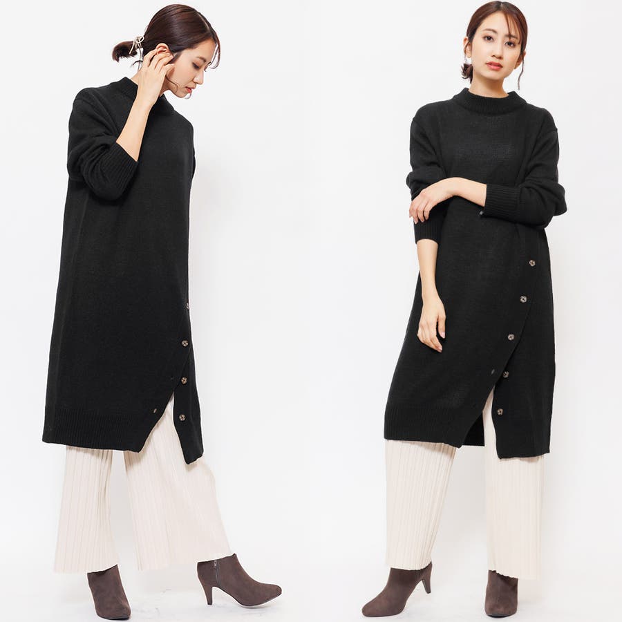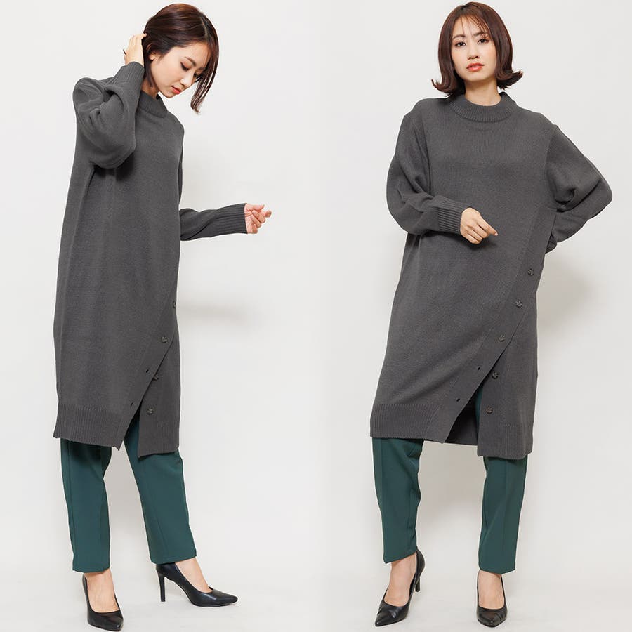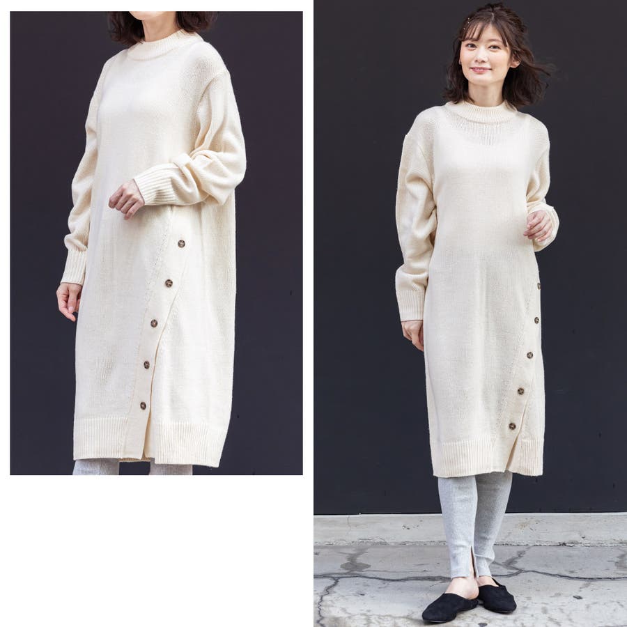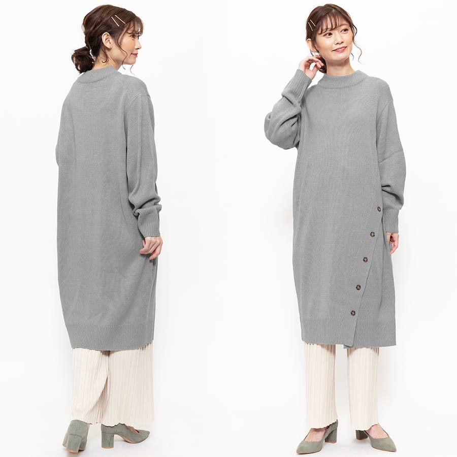 ウール混ニットワンピース ボタン袖 サイドスリット