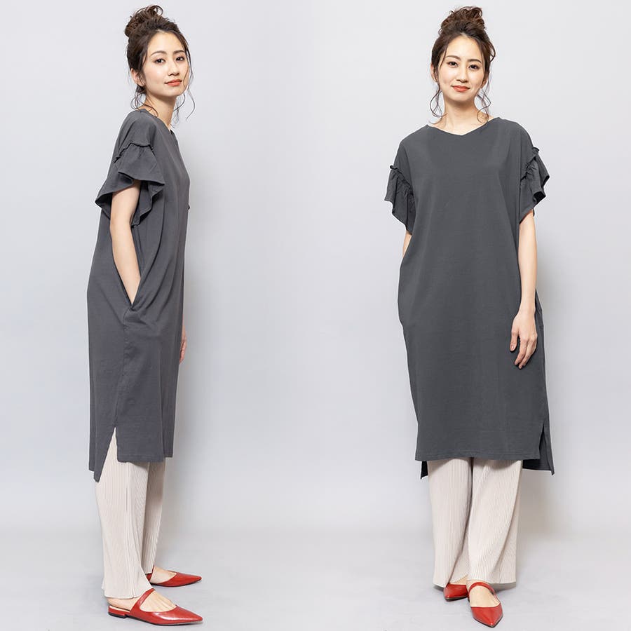 フリル袖 Tシャツワンピース サイドスリット