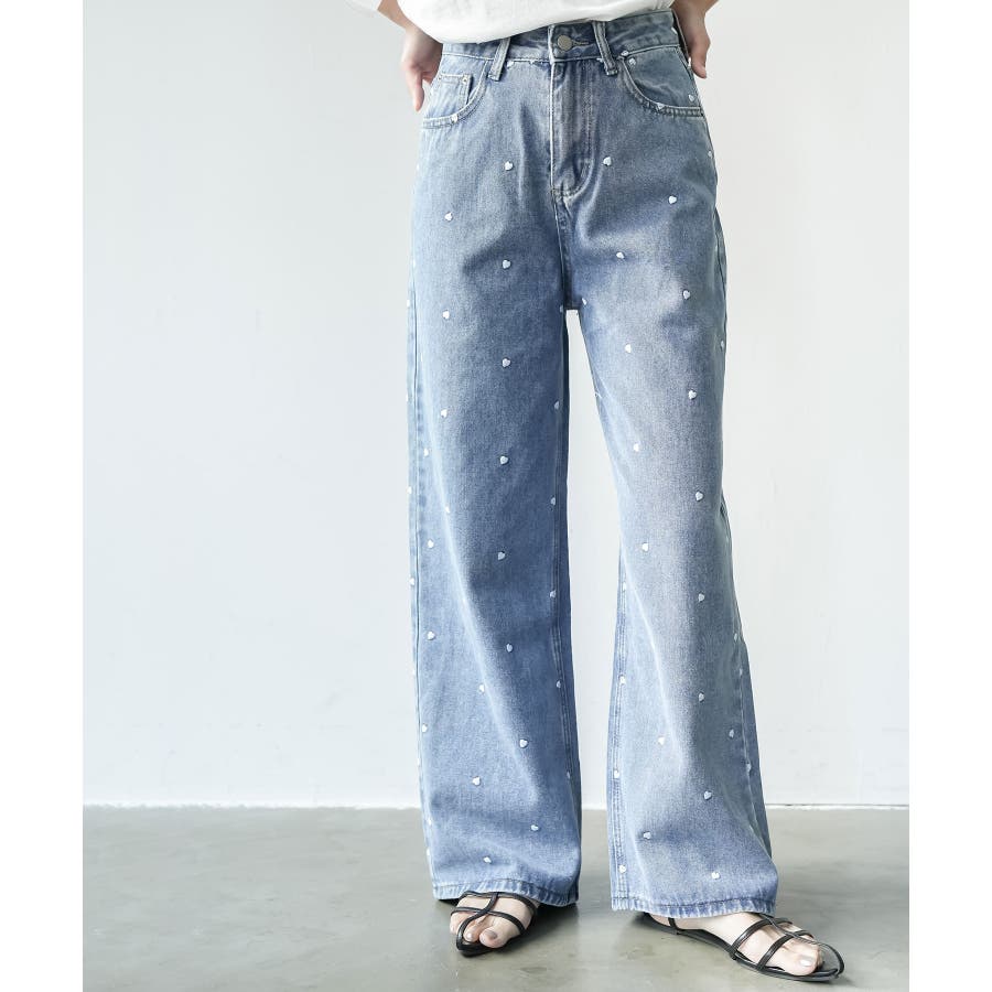 ハート刺繍デニムパンツ ロング丈 ボトムス