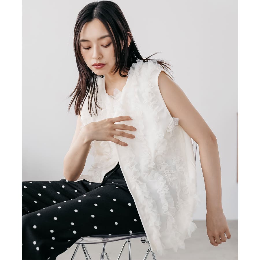 チュールフリルベスト ノースリーブ ノーカラー