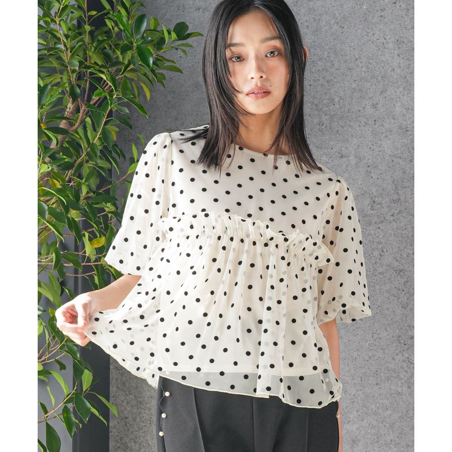 【アイボリー】フロッキードットバルーンスリーブフリルブラウス プルオーバー シアー