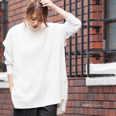 ミドル丈ハイネックニットベスト サイドスリット フレンチスリーブ