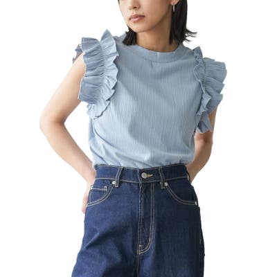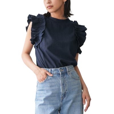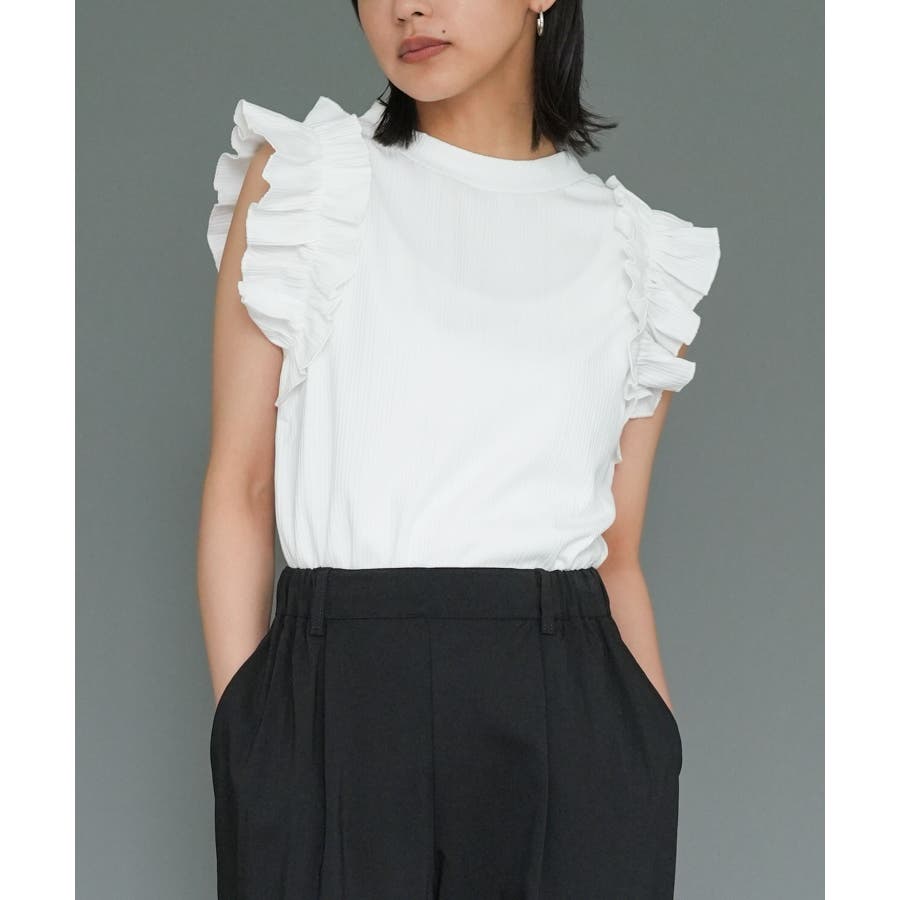 【ブラック】フリルスリーブリブタンクトップ トタンテレコリブ スタンドネック