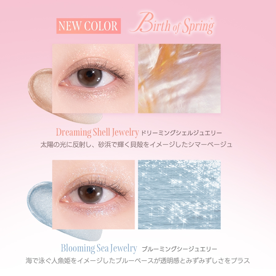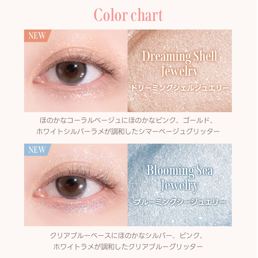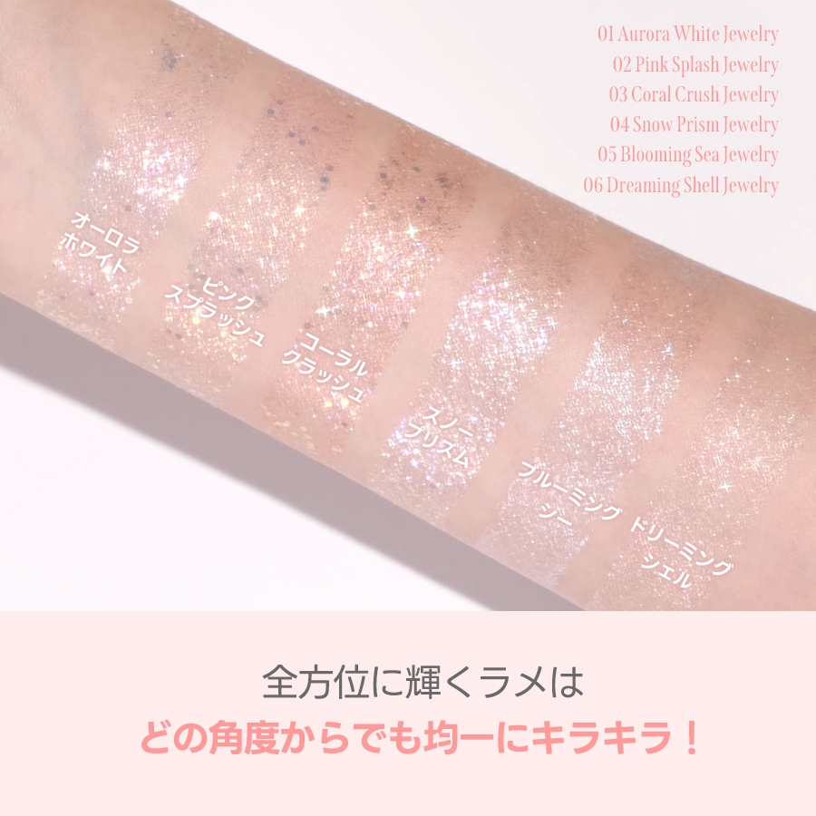 素材 | 【全成分】 <Aurora White Jewelry> 水、PET、(エチレン/VA)コポリマー、アクリレーツコポリマー、ホウケイ酸(Ca/チタン)、ポリ酢酸ビニル、1,2-ヘキサンジオール、(アクリロイルジメチルタウリンアンモニウム/VP)コポリマー、グリセリン、酸化チタン、PVP、ポリソルベート20、(アクリル酸ヒドロキシエチル/アクリロイルジメチルタウリンNa)コポリマー、フェノキシエタノール、マイカ、EDTA-2Na、エチルヘキシルグリセリン、イソステアリン酸ソルビタン、ポリソルベート60、酸化スズ、酸化鉄、トコフェロール <Pink Splash Jewelry> 水、PET、ポリブチレンテレフタレート、ポリメタクリル酸メチル、1,2-ヘキサンジオール、ホウケイ酸(Ca/チタン)、アクリレーツコポリマー、(エチレン/VA)コポリマー、(アクリロイルジメチルタウリンアンモニウム/VP)コポリマ ー、グリセリン、PVP、ポリソルベート20、(アクリル酸ヒドロキシエチル/アクリロイルジメチルタウリンNa)コポリマー、フェノキシエタノール、酸化チタン、マイカ、EDTA-2Na、エチルヘキシルグリセリン、イソステアリン酸ソルビタン、ポリソルベート60、酸化鉄、酸化スズ、トコフェロール <Coral Crush Jewelry> 水、PET、(エチレン/VA)コポリマー、アクリレーツコポリマー、ホウケイ酸(Ca/チタン)、ポリ酢酸ビニル、1,2-ヘキサンジオール、酸化チタン、アクリロイルジメチルタウリンアンモニウム/VP)コポリマー、グリセリン、PVP、ポリソルベート20、(アクリル酸ヒドロキシエチル/アクリロイルジメチルタウリンNa)コポリマー、マイカ、フェノキシエタノール、酸化鉄、EDTA-2Na、エチルヘキシルグリセリン、イソステアリン酸ソルビタン、ポリソルベート60、酸化スズ、トコフェロール <Snow Prism Jewelry> 水、ホウケイ酸(Ca/チタン)、ポリ酢酸ビニル、PET、1,2-ヘ キ サンジオール、ホウケイ酸(Ca/Al)、(エチレン/VA)コポリマー、アクリレーツコ ポリマー、(アクリロイルジメチルタウリンアンモニウム/VP)コポリマー、グリセリン、PVP、ポリソルベート20、酸化チタン、ポリメタクリル酸メチル、(アクリル酸ヒドロキシエチル/アクリロイルジメチルタウリンNa)コ ポ リ マ ー、EDTA-2Na、エチルヘキシルグリセリン、酸化スズ、イソステアリン酸ソルビタン、ポリソルベート60、合成フルオロフロゴパイト、シリカ、トコフェロール、酸化鉄 <Dreaming Shell Jewelry> 水、ホウケイ酸(Ca/チタン)、PVP、1,2-ヘキサンジオール、ホウケイ酸(Ca/Al)、(アクリロイルジメチルタウリンアンモニウム/VP)コポリマー、酸化チタン、マイカ、エチルヘキシルグリセリン、酸化スズ、パンテノール、セラミドNP、ハスエキス、BG、ツボクサエキス、トルマリン、ネフライト末、アメジスト末、サファイア末、ルビー末、ダイヤモンド末、トコフェロール、酸化鉄 <Blooming Sea Jewelry> 水、ホウケイ酸(Ca/Al)、1,2-ヘキサンジオール、グリセリン、(アクリロイルジメチルタウリンアンモニウム/VP)コポリマー、ポリソルベート20、ホウケイ酸(Ca/Na)、(アクリル酸ヒドロキシエチル/アクリロイルジメチルタウリンNa)コポリマー、カルボマー、酸化チタン、酸化スズ、マイカ、エチルヘキシルグリセリン、イソステアリン酸ソルビタン、ポリソルベート60、セラミドNP、パンテノール、ハスエキス、BG、ツボクサエキス、ルビー末、ネフライト末、トルマリン、サファイア末、ダイヤモンド末、アメジスト末、トコフェロール、コンジョウ |