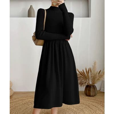 長袖ニットワンピ黒 韓国風ワンピ細見え お洒落ワンピ着やせ