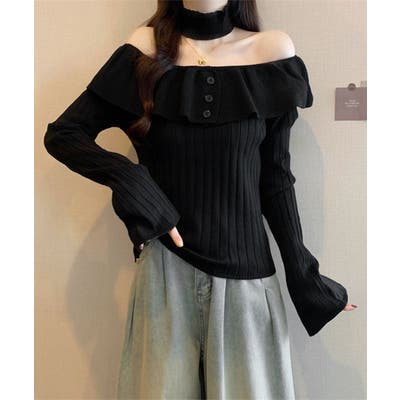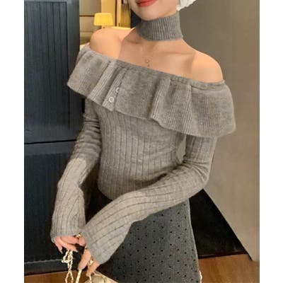 デコルテをきれいに見せるオフショルデザインが魅力のリブニットトップス。