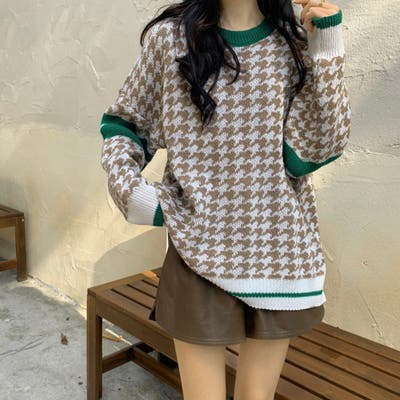 千鳥柄ニットトップス 秋冬長袖韓国ニット