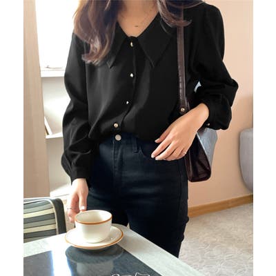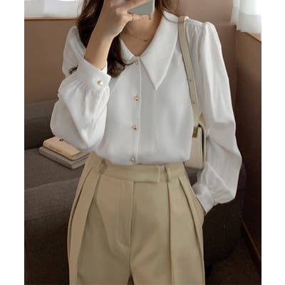 尖った襟がアクセントになったクラシカルなシャツブラウス。