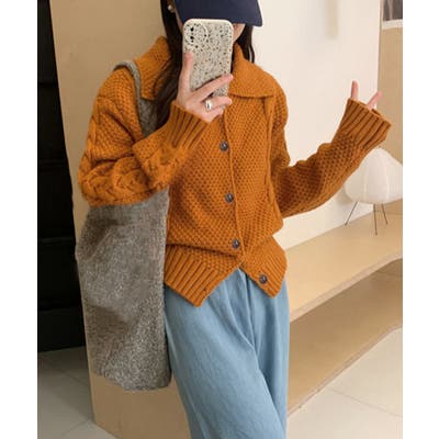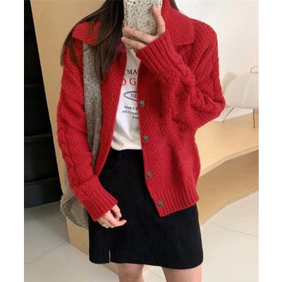 ケーブル編みニットカーディガン ビッグ襟