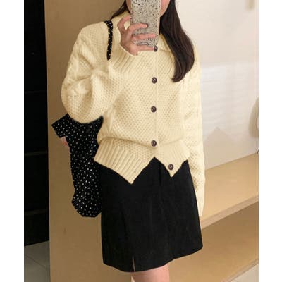 ざっくりとしたケーブル編みと立体感のあるビッグカラーが華やかさを添えるショート丈ニットカーディガン。