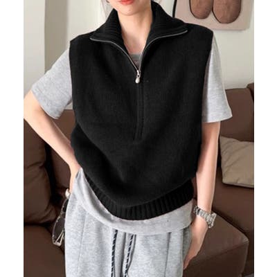 スタンドカラーとハーフジップが特徴的なニットベスト。