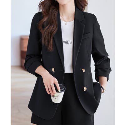 金色のボタンが上品な輝きを放つ、ダブルブレストデザインのテーラードジャケット。