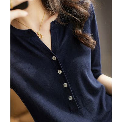 上品なVネックラインがデコルテを美しく強調し、スタイリッシュな印象を与えます