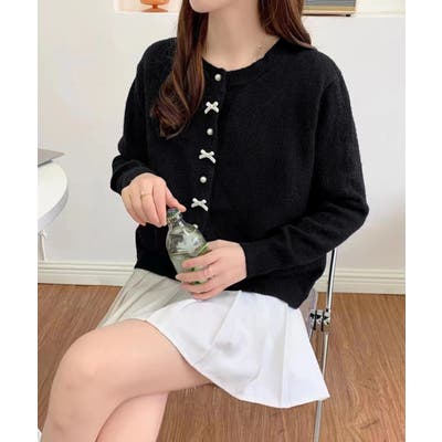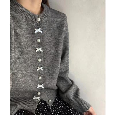 リボンとパールボタンがアクセントになった、ガーリーなニットカーディガン。