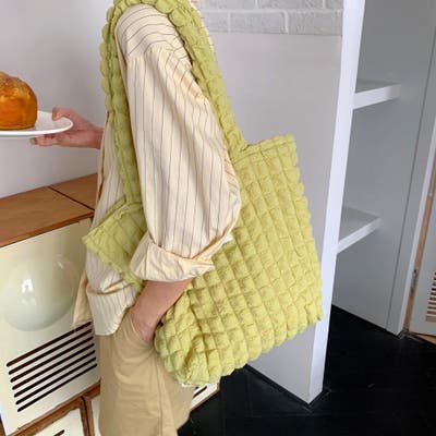 ぷくっと立体感のあるポップコーン生地がおしゃれ、持つだけでこなれ感のあるトートバッグ