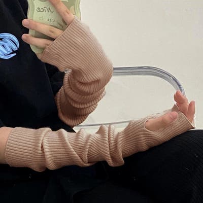 リブ編みで温かく、今季トレンドのロングニットアームウォーマー