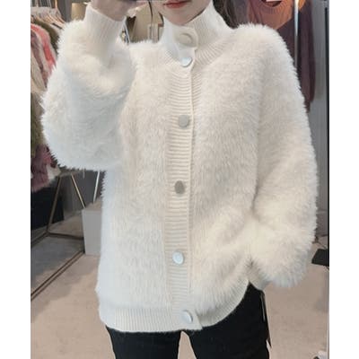 レディース シャギーニットカーディガン ふわふわトップス もこもこ カジュアルきれいめ 立ち襟 長袖ニットアウターお洒落