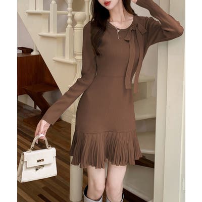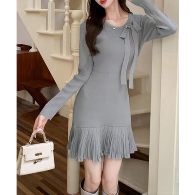 胸元のリボンと裾のプリーツフリルがアクセントの長袖リブニットワンピース。