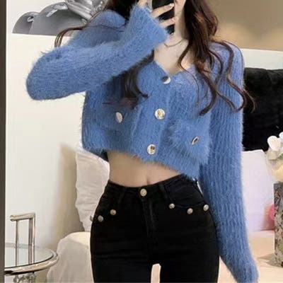 韓国ファッション秋 大人お洒落きれいめ 起毛Vネックニット