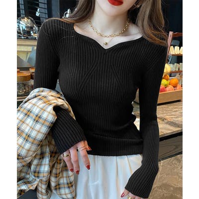 ハートネックで首元がすっきり綺麗に見える長袖タイトニットトップス