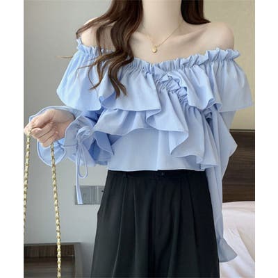 Vネックでデコルテを美しく見せ、肩のフリルを落とすとオフショルダーでも着られる2way仕様