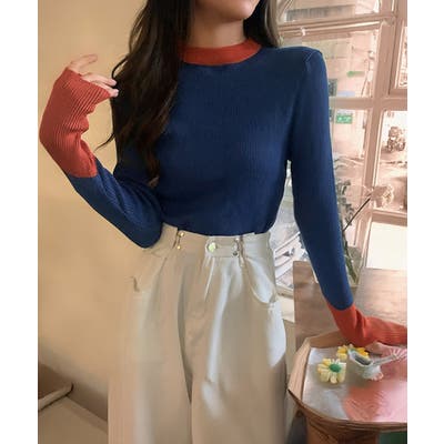 遊び心あふれる配色カラーが魅力のニットトップス。