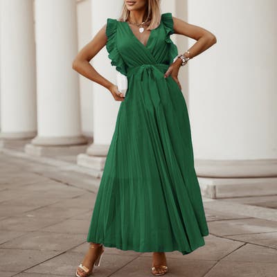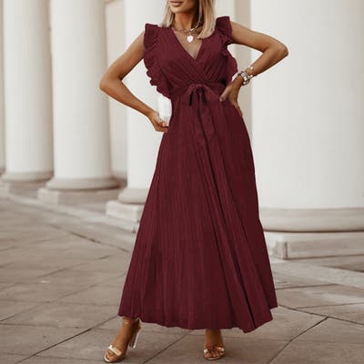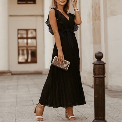 上品で優雅な印象を与えるプリーツロングワンピース。