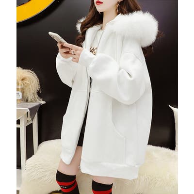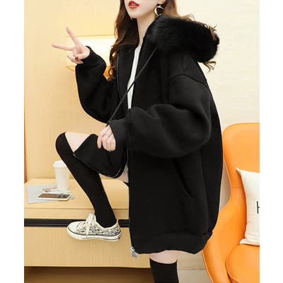 ふわふわのファーフード付きで、大人カジュアルにぴったりの裏微起毛ジップアップパーカー