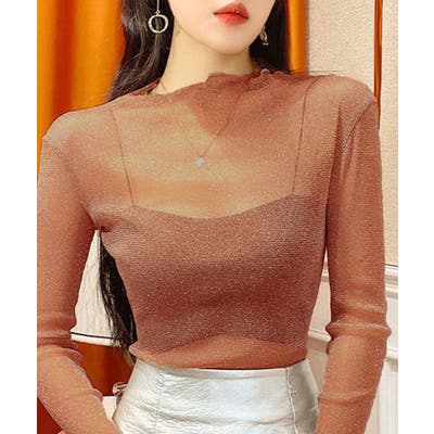 ラメ感のあるデザインでコーディネートを華やかに仕上げるシースルートップス