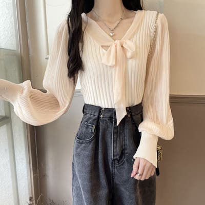 胸元の大きなリボンで一枚でもまたインナーとして着用していただいても上品に演出してくれるプリーツリブニット