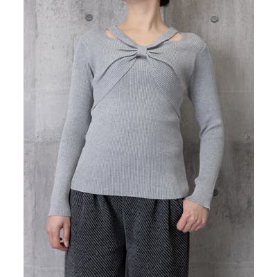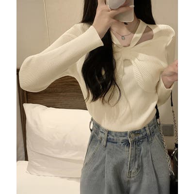 フロントの大きいリボンデザインとホルターネックがお洒落なニットトップス。
