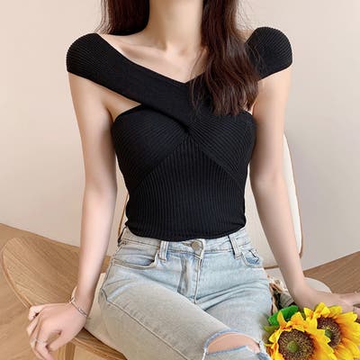 ニットトップス レディース クロスデザイン セクシーリブニット Vネック 無地 肩だしニット フィット感 ニットインナー