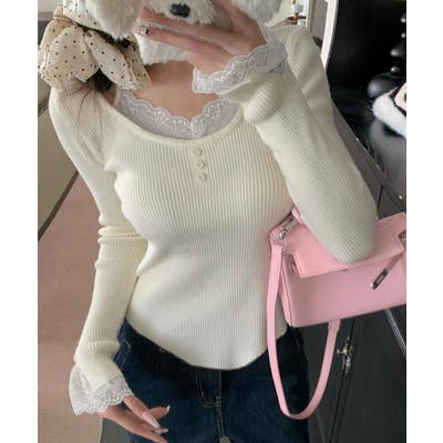 レイヤードニットトップス レース切替え