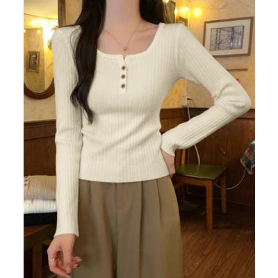 シンプルニットソー 普段着細身トップス リブニットおしゃれ